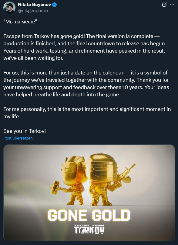 Gone Gold Edition>0.16.9.0 Patch noteshttps://www.escapefromtarkov.com/news/id/351>Where to get the latest Russian sneedwarehttps://www.escapefromtarkov.comAlso coming to Steam, November 15https://store.steampowered.com/app/3932890/Escape_from_Tarkov/>Arena websitehttps://arena.tarkov.com/>Ammo chartshttps://eft-ammo.com>Gun Builder Website (Overswing calculator included)https://db4tarkov.com/gun>For the newfagsComment too long. Click here to view the full text.