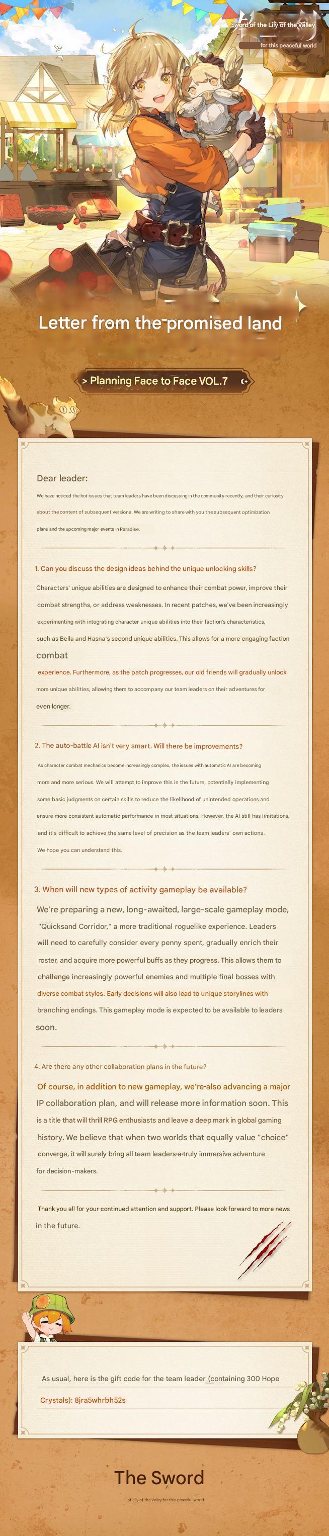 Rawiyah is sleeping editionPrevious: >>539885360>What is Sword of Convallaria?Sword of Convallaria is part gacha, part full-length SRPG in the vein of FFT and Tactics Ogre, with very light rogue elements. Originally released in the country of Taiwan, also has a separate CN version, a JP version and a Global version.>FAQhttps://rentry.org/socnewbie>Helpful links and resourceshttps://rentry.co/oiiitiuo>Current EventsDungeon Meshi Collab (2025/08/29-2025/09/23)>Current and Upcoming BannersGet Together: Gloria + Dantalion(2025/09/19 – 2025/10/06)SP Samantha (2025/09/26 – 2025/10/09)Samantha (2025/09/26 – 2025/10/09)>GuildsTouch Vlder TailSorceress HatApply to a guild then reply to the OP or recruiter ITT with the last 4 digits of your UID and mention the guild you are applying to.>Redeem codesSOC365EN (valid until ?)ENMOONCAKE