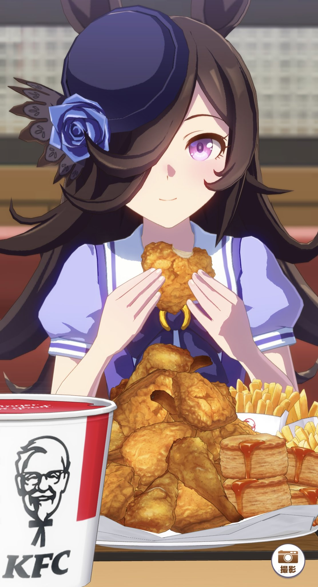 >(You) try to cheer her up by doing an impression of Peco while scoffing all the food