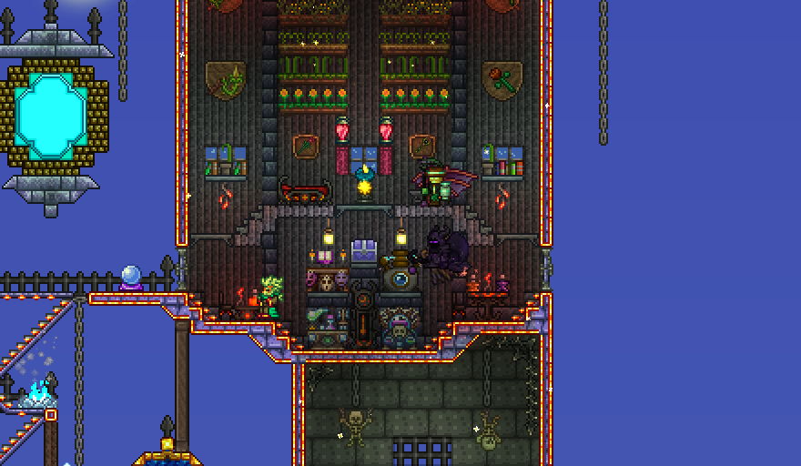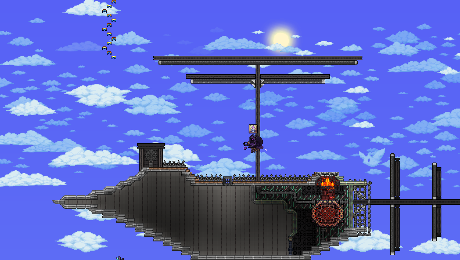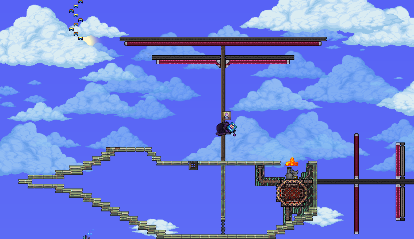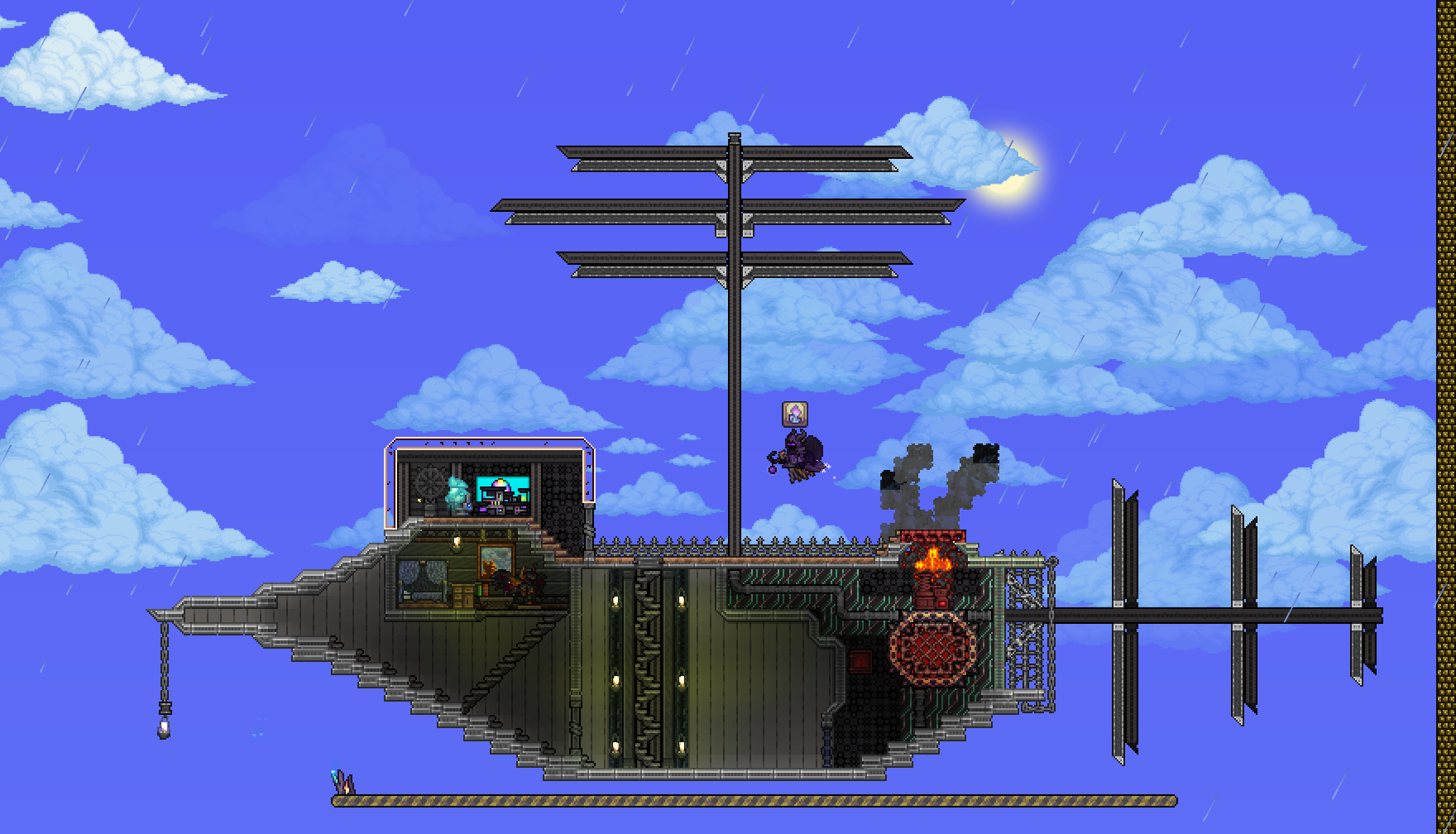 >>542693315I like what you've done with the engine/boilerShips and by extension, building are indeed difficult thoughWish I could help>>542694893Hmm, I know you have to be ~47 tiles away vertically to avoid spawns altogether, so you might be too close to the ground? Are there any NPCs shacked up there perchance? They lower spawnratesI'd still recommend making the artificial jungle biome to see if it helpsThis image might be useful as well