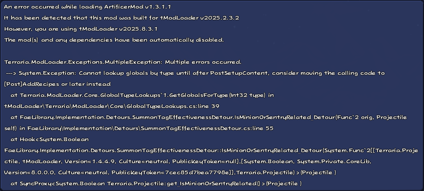 >>541871424I was trying to add a mod that added a couple removed/unreleased Calamity items. Now every mod loading so far has had the same exact error. Shit's pissing me off.>pic isn't mod in question