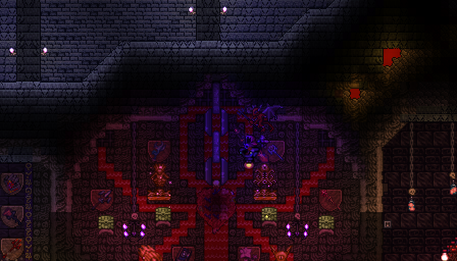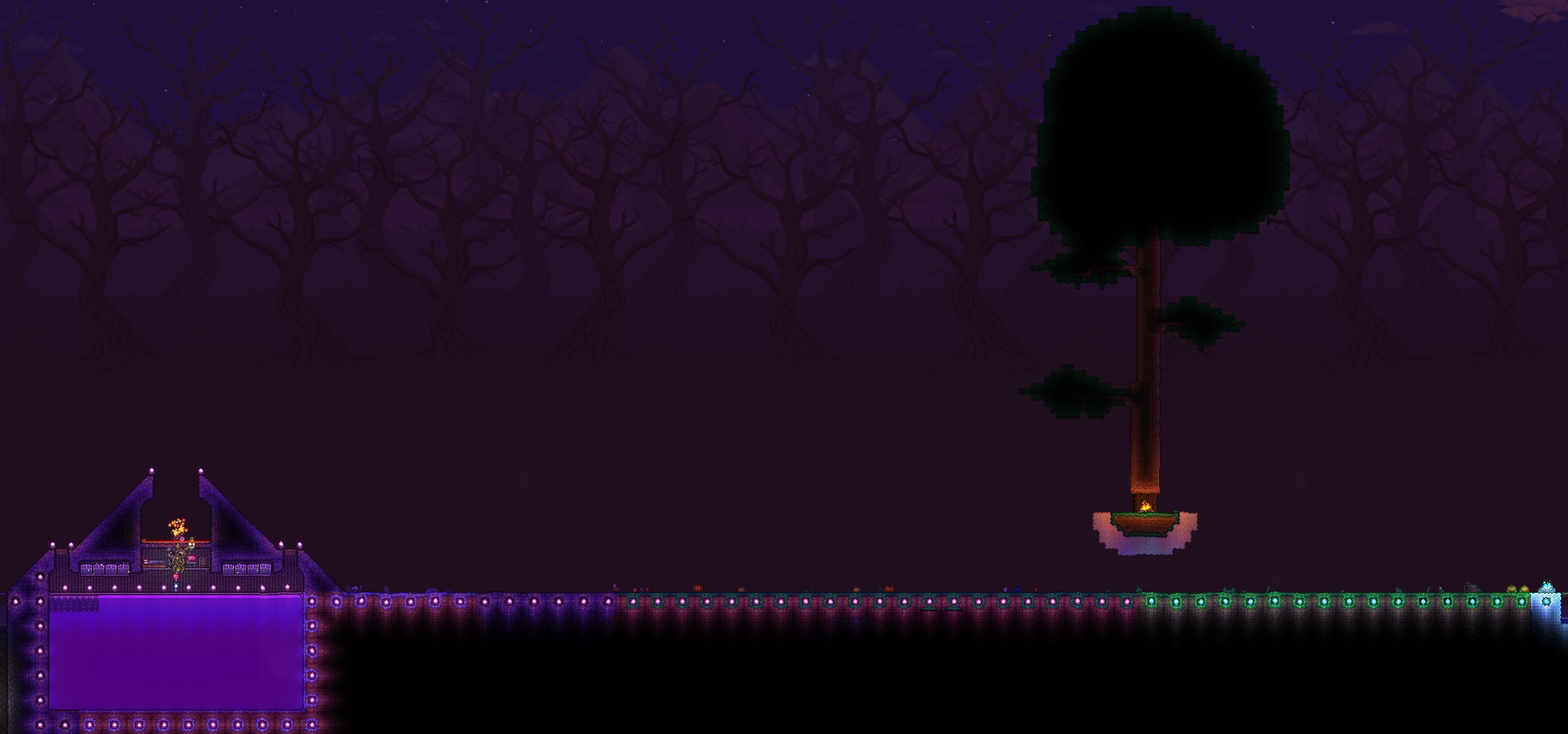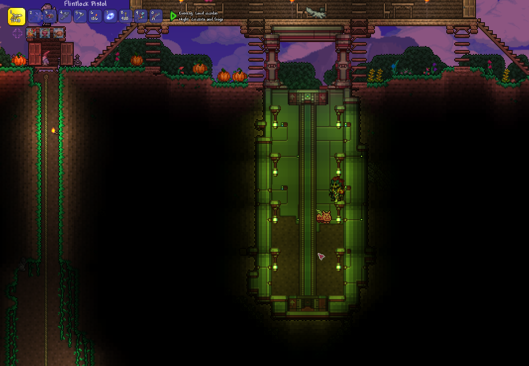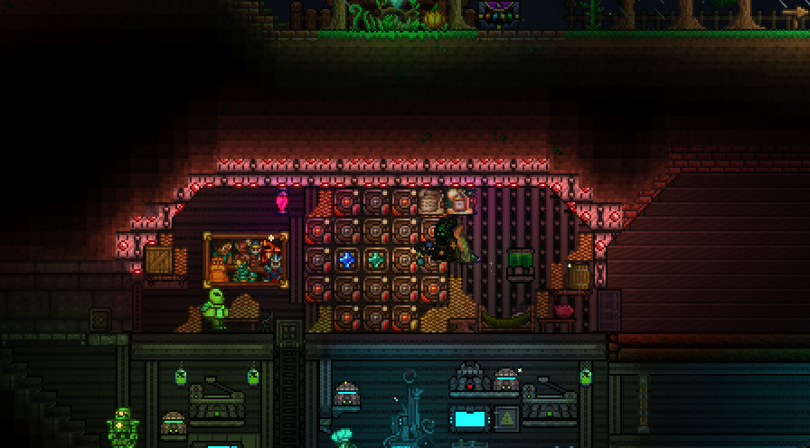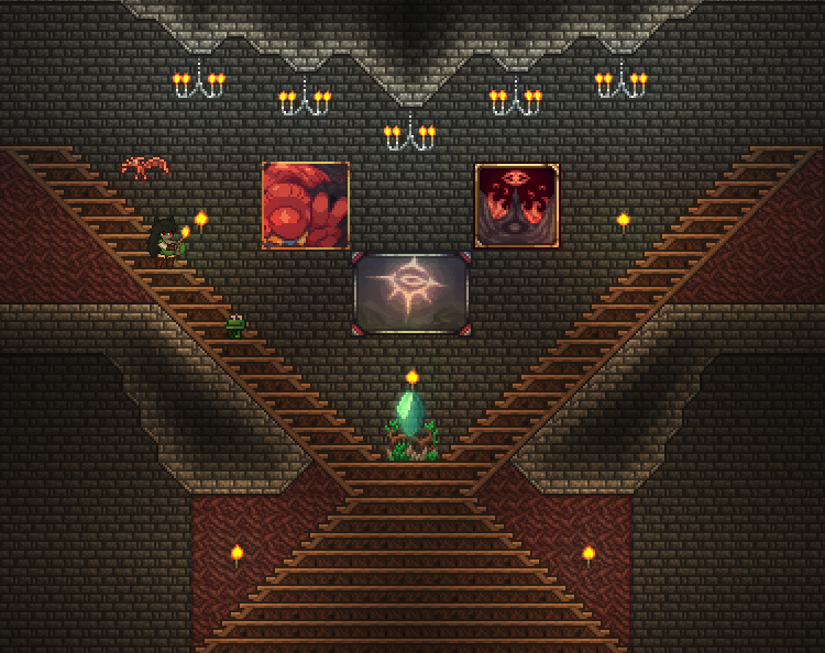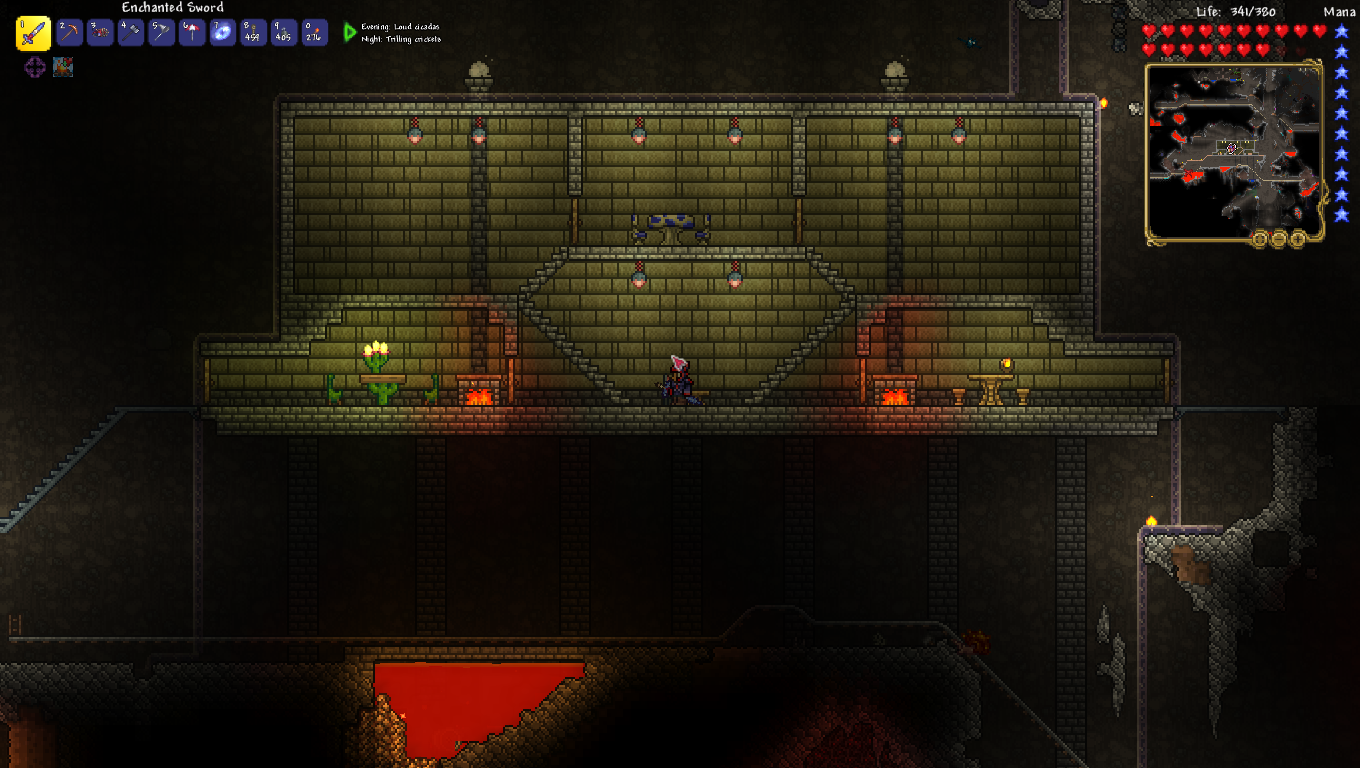 made a volcano farm in the corruption to farm for rotten chunks to then be able to farm eater of worlds. it is very profitable. have gotten the trophy from eater of worlds and might make a display room or something for it soon. should start studying for my exams so will probably wait with hardmode until i am done with those. also, you guys probably already knew this but lava fishing doesn't have to be done in the underworld. i felt really stupid when i realised that any decently sized lava pool suffices. i used to always dread lava fishing since the enemies in the underworld are so annoying, but this time around i was able to fish for the demon conch without any trouble and then make my shellphone. regarding the fishing spot in my jungle tree, i have been able to complete angler quests from it so it fills its purpose.>>542763773>>542779483>>542781095thanks for the praise!>>542775004looks great!
