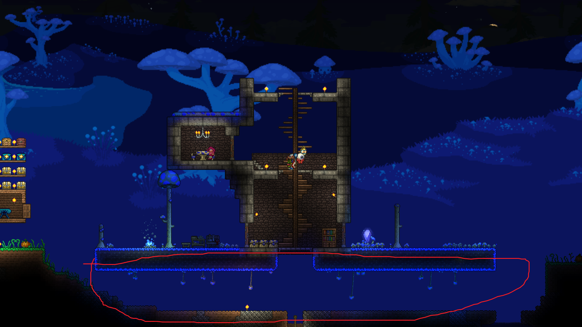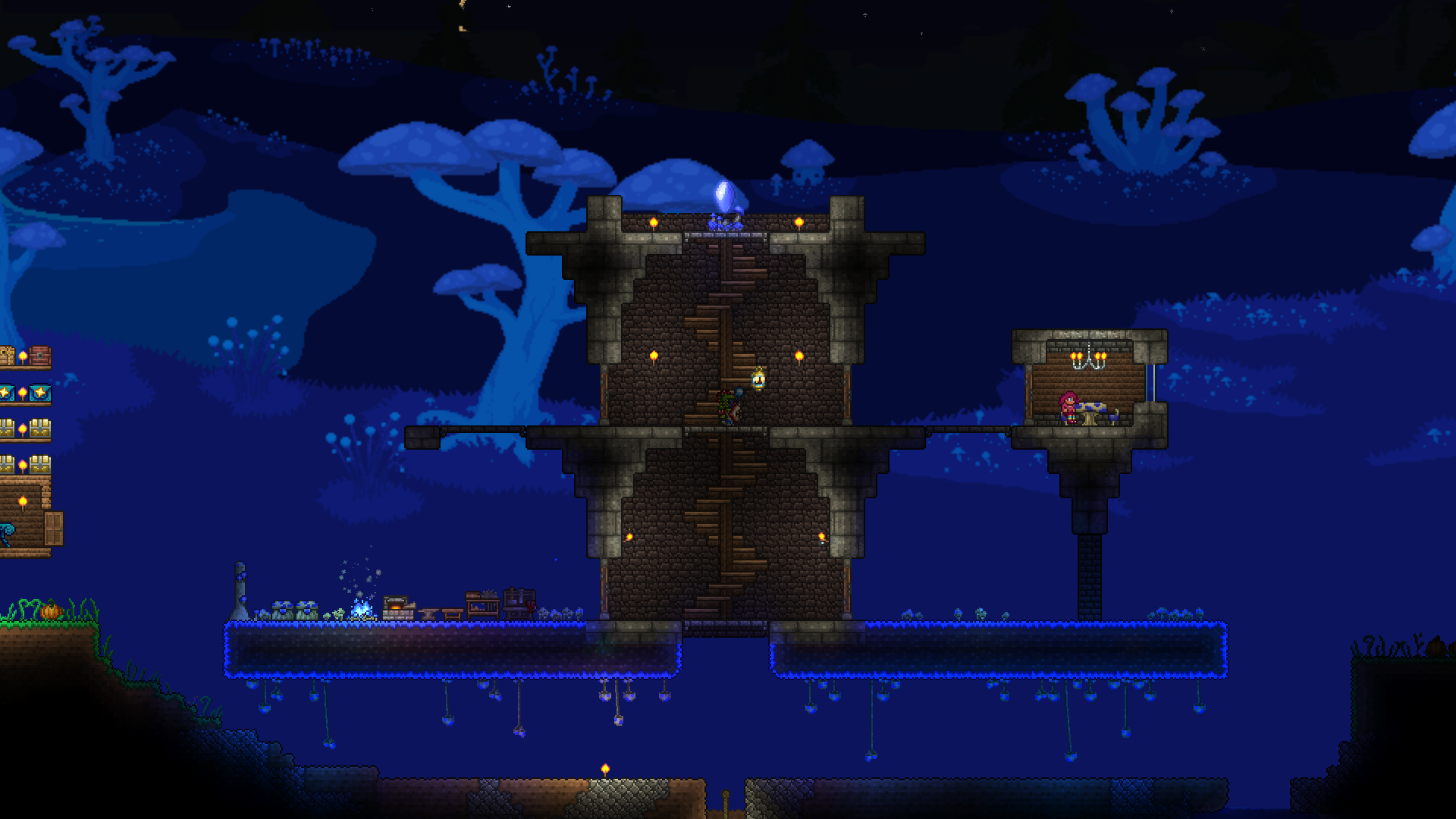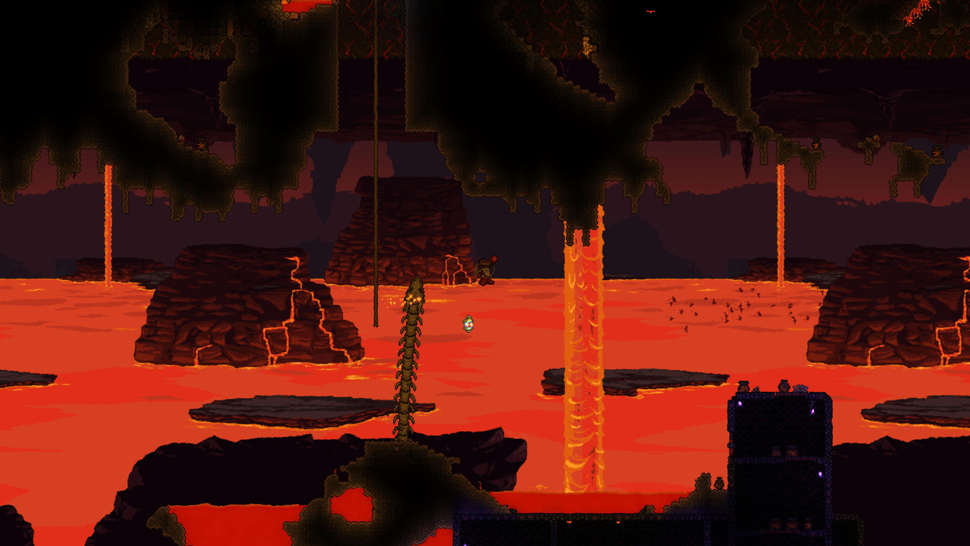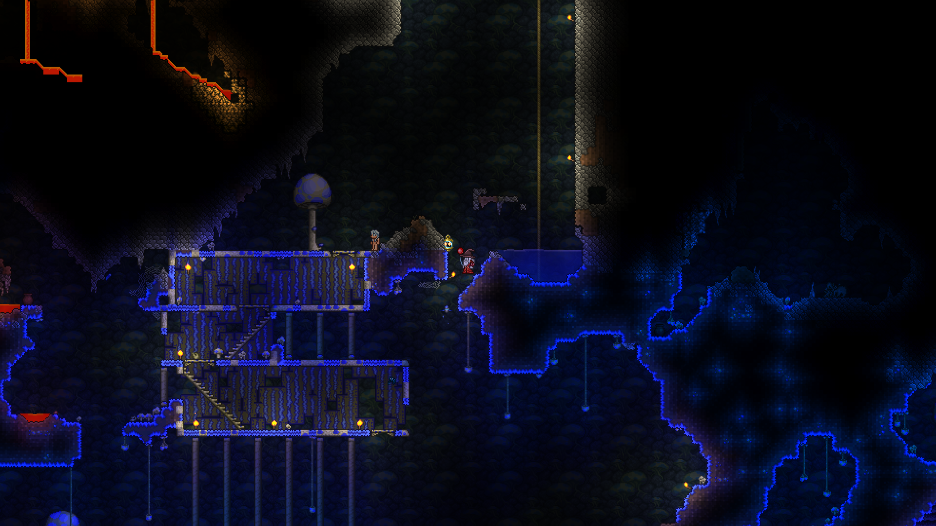 made a volcano farm in the corruption to farm for rotten chunks to then be able to farm eater of worlds. it is very profitable. have gotten the trophy from eater of worlds and might make a display room or something for it soon. should start studying for my exams so will probably wait with hardmode until i am done with those. also, you guys probably already knew this but lava fishing doesn't have to be done in the underworld. i felt really stupid when i realised that any decently sized lava pool suffices. i used to always dread lava fishing since the enemies in the underworld are so annoying, but this time around i was able to fish for the demon conch without any trouble and then make my shellphone. regarding the fishing spot in my jungle tree, i have been able to complete angler quests from it so it fills its purpose.>>542763773>>542779483>>542781095thanks for the praise!>>542775004looks great!