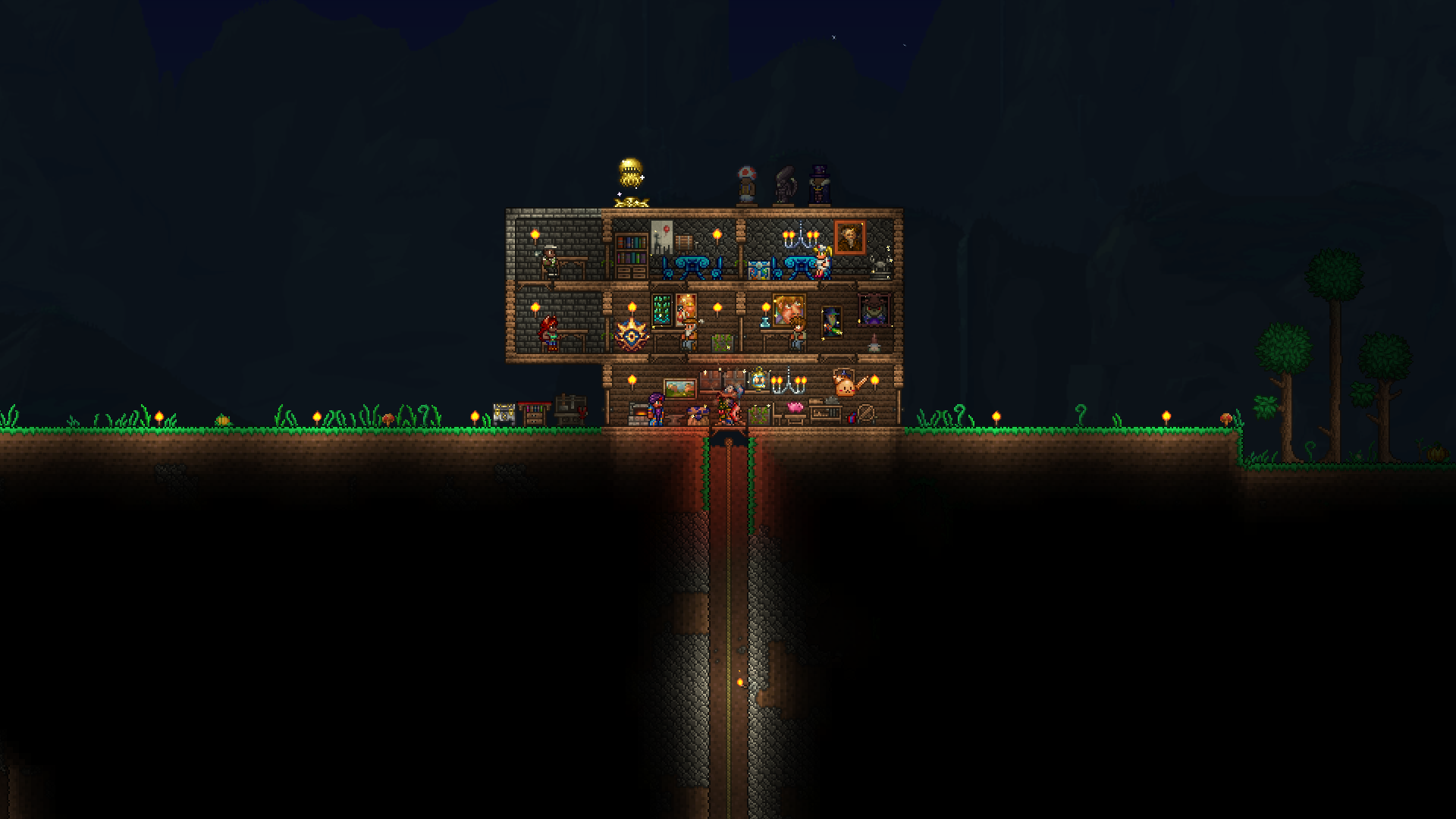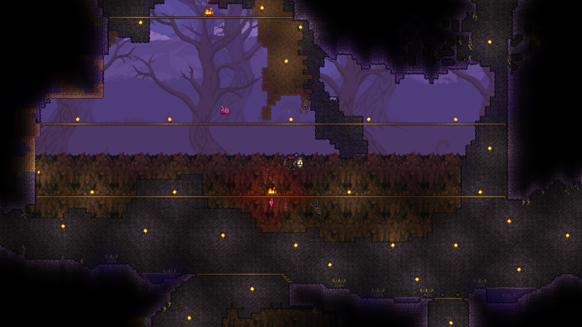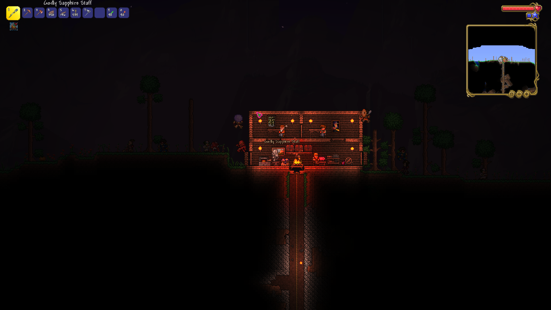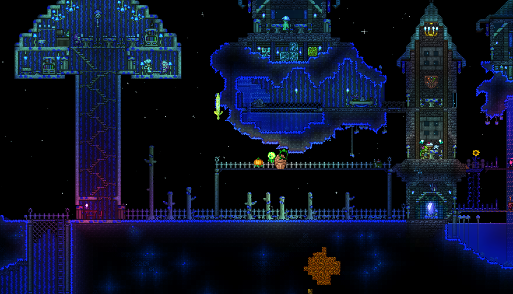 made a volcano farm in the corruption to farm for rotten chunks to then be able to farm eater of worlds. it is very profitable. have gotten the trophy from eater of worlds and might make a display room or something for it soon. should start studying for my exams so will probably wait with hardmode until i am done with those. also, you guys probably already knew this but lava fishing doesn't have to be done in the underworld. i felt really stupid when i realised that any decently sized lava pool suffices. i used to always dread lava fishing since the enemies in the underworld are so annoying, but this time around i was able to fish for the demon conch without any trouble and then make my shellphone. regarding the fishing spot in my jungle tree, i have been able to complete angler quests from it so it fills its purpose.>>542763773>>542779483>>542781095thanks for the praise!>>542775004looks great!
