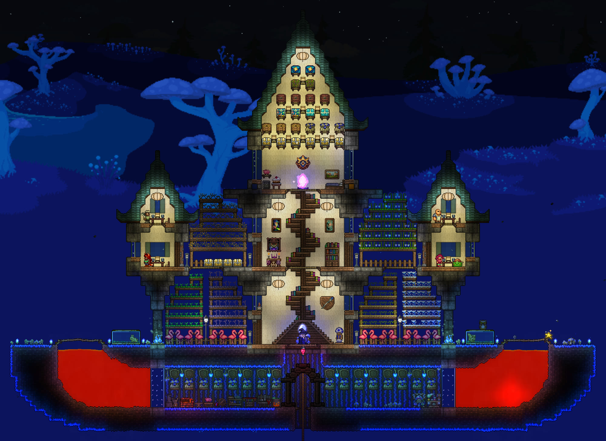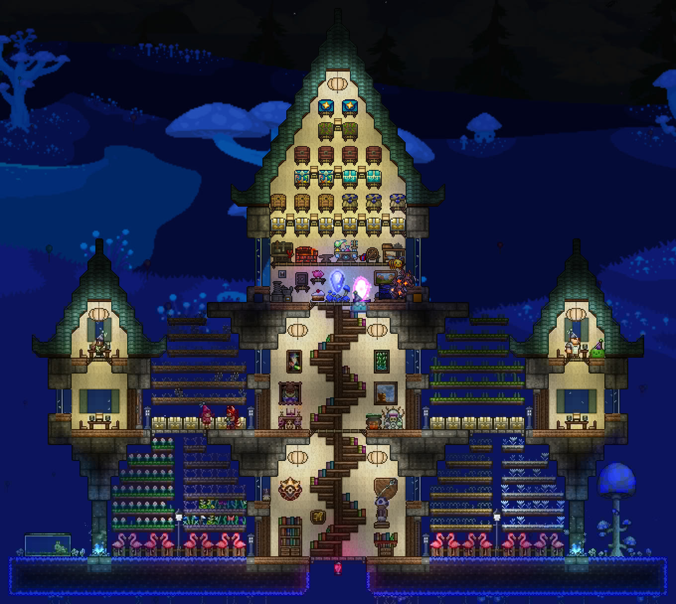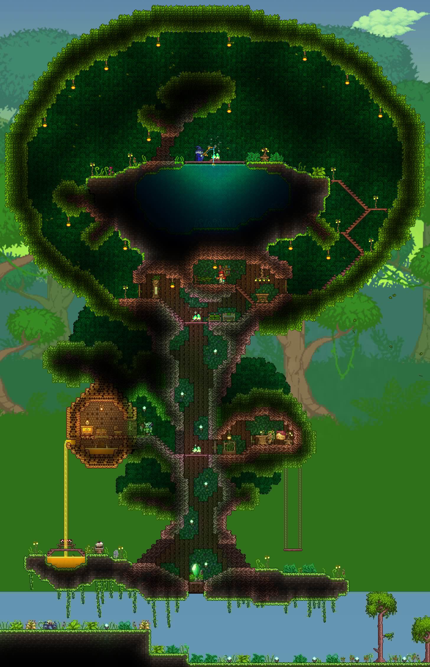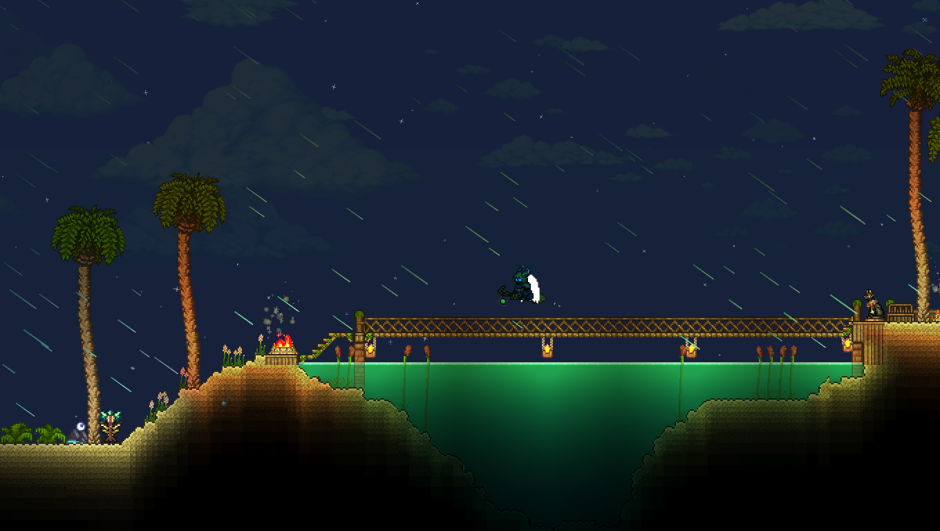 >>542753167>>542762759Responded a bit too early, but again, looks great!As for fishing spots, they need 300 tiles of connected water blocks to not incur penalties, but can be made with less. Also, water that is pressed up against the underside of an overhang doesn't count as "connected", so your "valid fishing area" is only about as wide as the opening on top, and it goes straight down in a rectangular shape. It's really not that big a deal if it's mainly for aesthetics.You can read up a little more on it here if you're interested:https://terraria.wiki.gg/wiki/Fishing#RequirementsAll that being said, again, the tree looks fantastic and much better than anything I could make.>>542775004Progress!If I may, I'd suggest perhaps putting a few iron crates or barrels in the cargo hold, maybe with a pile of black-painted copper coins to look like coal? The after propellers could also be sliiighly more tightly packed, imo. I think the party girl also sells a smoke machine that you could potentially add in later, and paint with echo paint to turn it invisible.