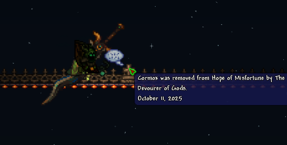 >try to fight Vagrant of Space and Time>boss summoning item spawns fucking 20-30 of them because a mod i had installed was somehow causing it to bug out>mfw they all use Meteor Showeri'm never adding Binding of Isaac trinkets to Terraria again