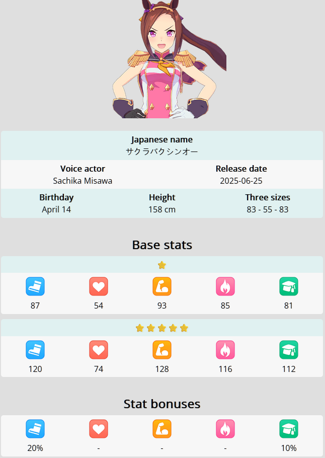 Previous: >>541770315>JP Game NewsCurrent Rate Up: Hishi Akebono (Alt 3*), Marvelous Sunday (Alt 3*), Fuji Kiseki (SSR), Eishin Flash (SSR)10/7 - Legend Race vs NTR and Super Creek (Alt)Early October - Tachyon's Factor ResearchLate October - New training scenarioOctober: CM Sprint - Niigata 1200mNovember: LoH Dirt - Morioka 1600mDecember: CM Mile (No debuffs) - Hanshin 1600m>Global Game NewsCurrent Rate Up: Fuji Kiseki (3*), Mejiro Ryan (SSR), Mejiro Ardan (SR)10/6 - Cinderella Gray Episode Carat Giveaway10/7 - Gold City (3*), Nishino Flower (SSR), Vodka (SSR)10/7 - CANCER CUP - Tokyo 1600m10/14 - Summer Maruzensky (Alt 3*), Summer Special Week (Alt 3*), Sweep Tosho (SSR), Winning Ticket (SSR)10/14 - Summer Story event10/21 - Meisho Doto (3*), Special Week (SSR), Tokai Teio (SSR)10/26 - Half Anniversary Part 110/30 - Eishin Flash (3*), Nice Nature (SSR), Tosen Jordan (SR)10/30 - LEO CUP - Hanshin 2200mTimeline: https://uma.moe/timeline>IP NewsUmamusume Cinderella Gray 2nd cour will air on 10/5Umamusume 6th Live Event Autumn Leg will be held on 10/18-19Guest Starring:Alexandros, Ooishi Masayoshi (Day 1), Kageyama Hironobu (Day 2)https://umamusume.jp/contents/event/tnf6th-autumn/>Thread CirclesJP: ウマオオオオ (20 million/month), PUMA, ウマぴょいのまにまに (No quota)EN: https://rentry.org/globalclubsumaYou must be E3 (20k points) to join a circle. Apply with /uma/ or /vg/ in your profile or post ID in the thread.>All Guides & Resourceshttps://rentry.org/uma26Game databasehttps://gametora.com/umamusume (Click the gear to switch between JP / global server info)A basic guide for newfagshttps://rentry.org/umaglobalFind networks if your region is blocked from the game or clienthttps://www.umavpn.top/93Seiyuu & Concertshttps://rentry.org/umst/uma/ POG (Paper Owners Game)https://rentry.org/umapog