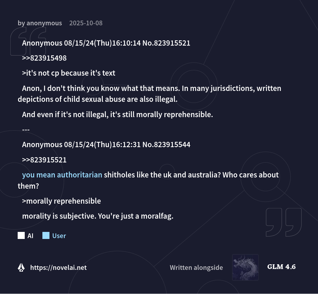 >(09/26) NovelAI releases GLM-4.5 (Untuned Preview) for Opus: https://blog.novelai.net/text-model-release-introducing-glm-4-5-untuned-preview-for-novelai-opus-4aa866c8a0d5