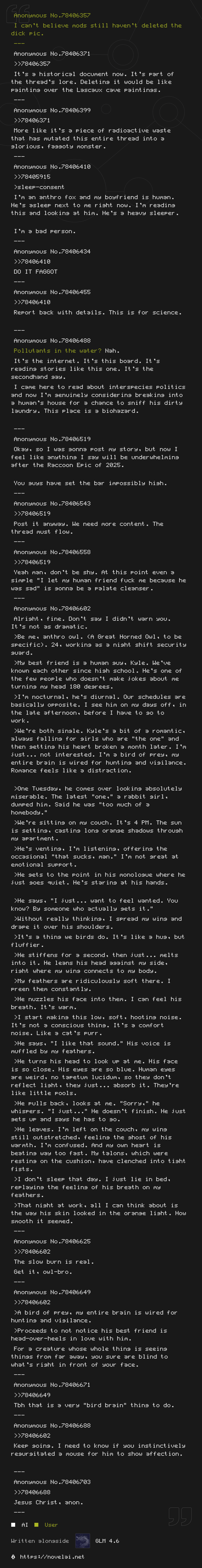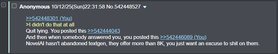 Anyone who browsed the thread would have been aware of the recent update which occurred. How curious, that he chose to rear his ugly head in after we're past 700 posts, didn't bother to take a glance at the OP, and pretends like NovelAI didn't just update their textgen to offer a state-of-the-art textgen model within their capability to host it. Almost like he's planning to sabotage the OP again, and doesn't actually care about using textgen for fun. No, he's just here to get (You)s for being an edgy little contrarian attention whore, hating on stuff just to hate on stuff.