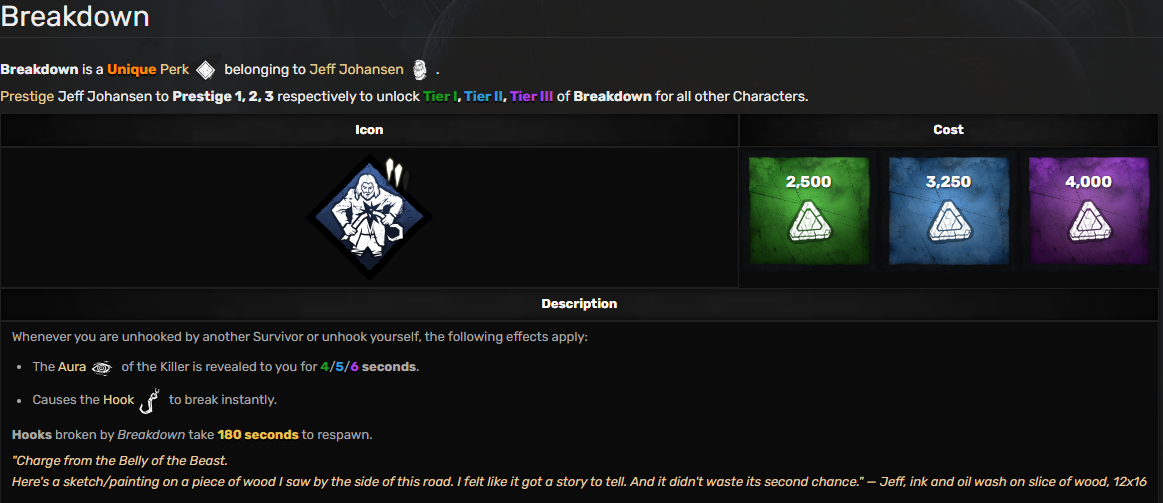>>541954802mindbreaker isn't awful, what are you talking about? it's a guarantee that any survivor you begin a chase with off gen cannot use any exhaustion perk in the chase, nor can they sprint burst away defensively. none of this is to mention how it can incidentally ruin all kinds of aura reading perks, most commonly such as disallowing survivors on gens to passively figure who should be doing what with kindred up.
