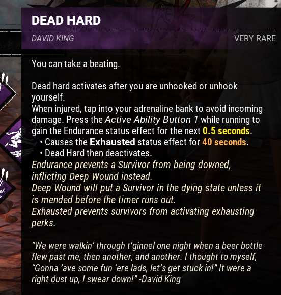 >>542251217I'm talking about the ingame description, I'm sure the other anon is too. I know Dead Hard can't be used while Exhausted, but for some reason, it doesn't say so on Dead Hard's description. It only mentions that Exhaustion disallows the use of perks which cause Exhaustion. Other perks still do say that they can't be used while Exhausted. It's just typical Behavior lack of cohesion.