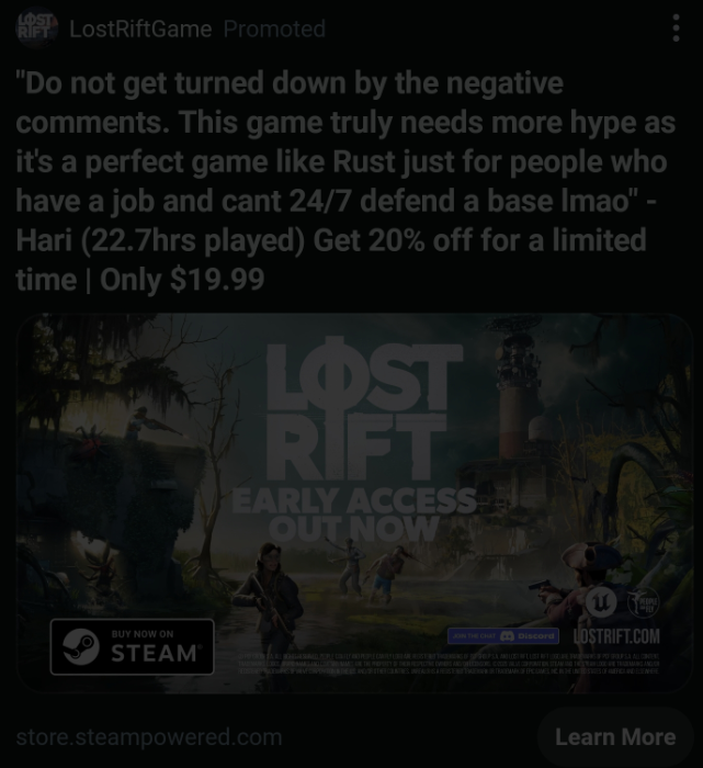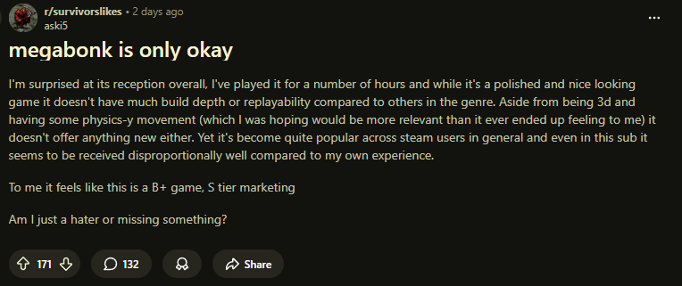 >>542074690you forgot the part where the dev is irl friends with moist critical and had him not only play it on his channel but also tell his fellow streamers such as vinny to play it too, good for him i guess but it shouldn't be used as a reference unless you too are friends with a popular streamer