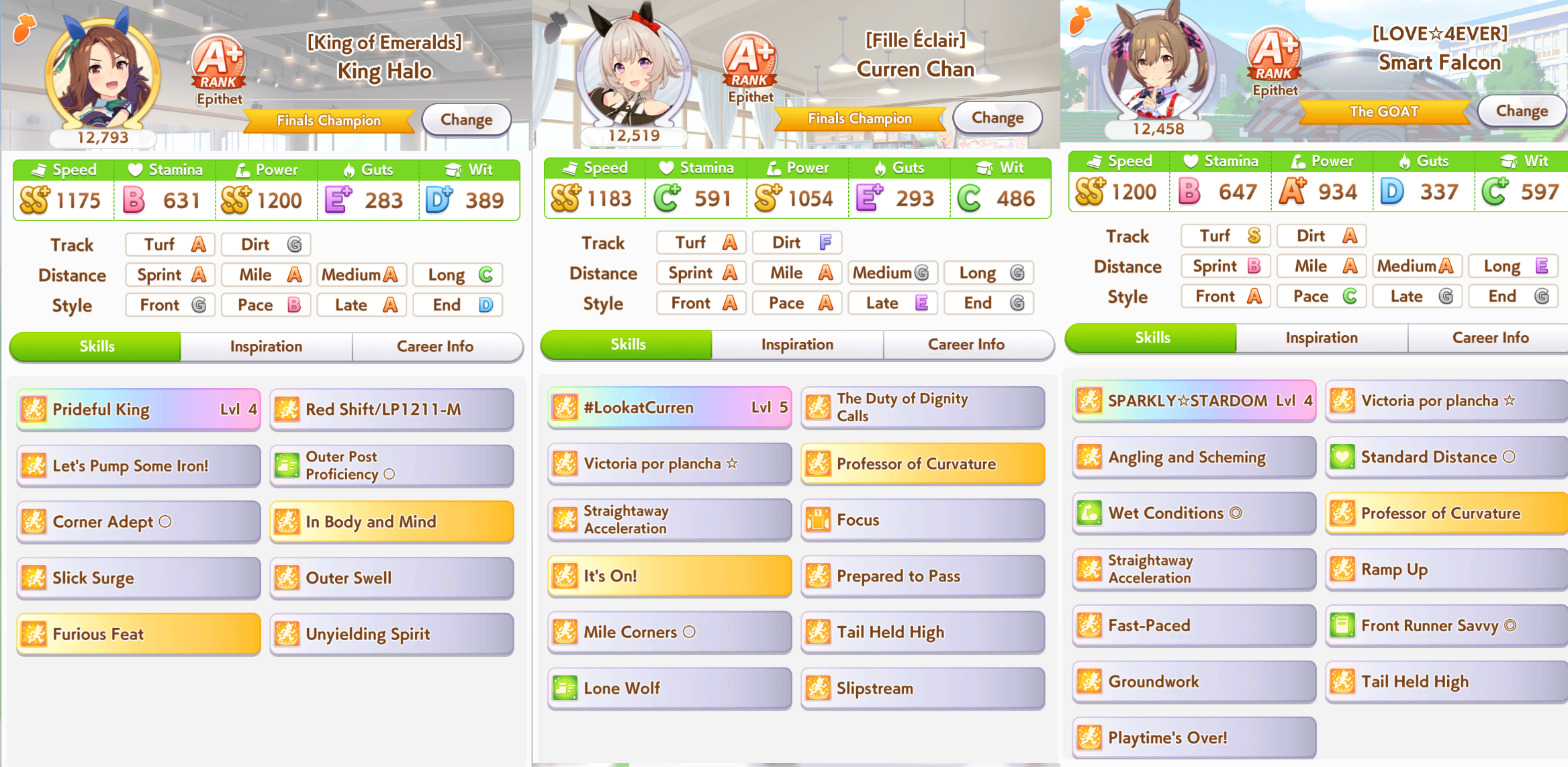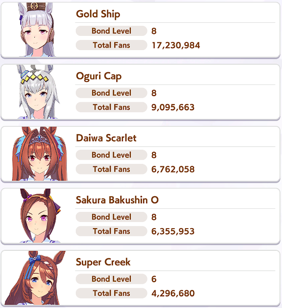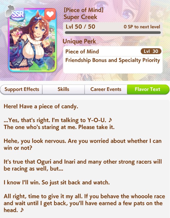 >>542076889I don't think it's gonna be that bad>firm conditionSuper Creek, King Halo>right-handedNarita Brian, Fine Motion, Fukukitaru (super rare)>non-standard distanceTop Gun>front savvySuzuka SSRThere are plenty of good choices thanks to firm condition, unlike in Cancer Cup so you just gotta try and get hanshin course/non-standard distance/summer runner from either skill sparks or race sparks like Queen Elizabeth and Takaruzuka Kinen