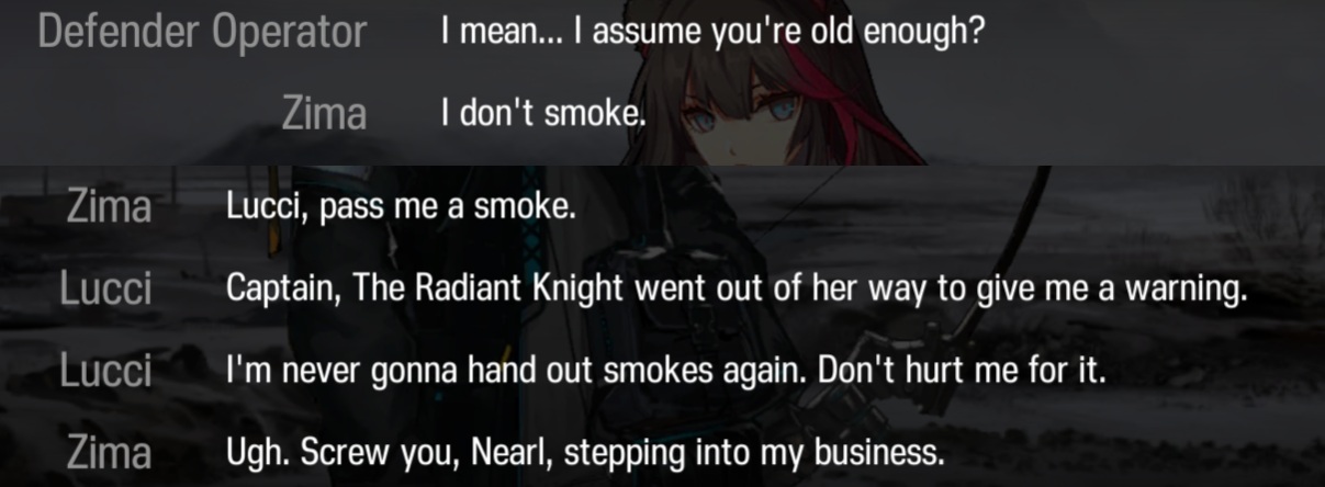 >>542140028Yeah, that's some serious dedication there. Sounds like she still takes it with a somewhat positive outlook despite everything. Very charming girl and an achingly sad fate.>>542140525I'll have to read her events sometime after I'm done with the main story. I like some nonesense fun, but a bit of additional substance is always nice.I take it our summer events are in the winter then? Since we're half a year behind and all.