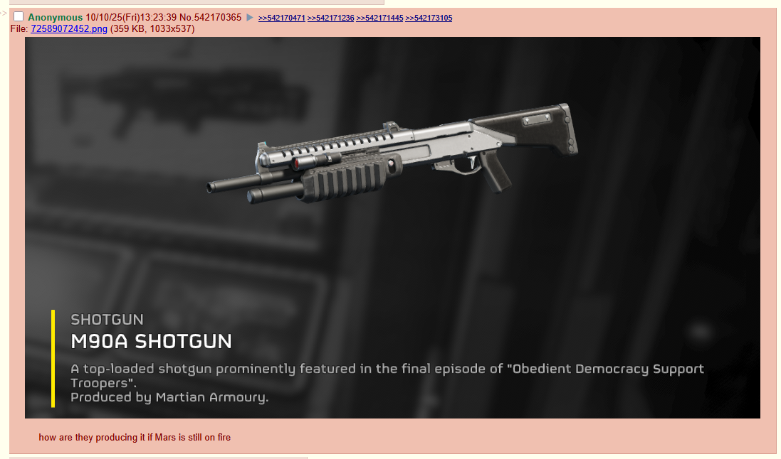 Previous thread: >>542068523>WHAT IS HELLDIVERS 2?HELLDIVERS 2 is a 2024 co-op, squad-based, PvE 3rd person shooter for PC, PS5, and Xbox Series X/S where players fight against hordes of alien insects, robots, and squids to spread Managed Democracy. Players wage war on a number of contested planets, each with a different environment, completing as many objectives as possible within a procedurally generated area while constrained by a time limit. With enough successful operations a planet can be completely liberated, and the player base must cooperate to try to liberate the entire galaxy by focusing and combining their efforts as much as possible.https://store.steampowered.com/app/553850/HELLDIVERS_2/https://www.playstation.com/en-us/games/helldivers-2/https://www.xbox.com/en-us/games/store/helldivers-2/9mx9wn9dfpgt>WHAT ABOUT THE FIRST HELLDIVERS GAME?Released in 2015 for PC, PS3/4 and PS Vita, the original HELLDIVERS is a shared screen top-down shooter in the same setting. Its mechanics were based primarily on Arrowhead's first game, Magicka.https://store.steampowered.com/app/394510/HELLDIVERS_Dive_Harder_Edition/https://www.playstation.com/en-us/games/helldivers/>LOBBY HOSTINGhttps://files.catbox.moe/83ixkr.png>MODDINGhttps://files.catbox.moe/c81ogo.png>INFORMATION RESOURCEShttps://helldivers.wiki.gg/https://helldiverscompanion.com/https://democracy-hub.nethttps://helldive.live>MAJOR NEWShttps://www.youtube.com/watch?v=gUC24yAP7Sohttps://www.youtube.com/watch?v=dJi8VsvnkoEhttps://www.youtube.com/watch?v=5L-UQQIFQhw>LATEST PATCHESSep 02 1.004.000 https://store.steampowered.com/news/app/553850/view/516345493302805199Sep 04 1.004.001 https://store.steampowered.com/news/app/553850/view/516346126609155527