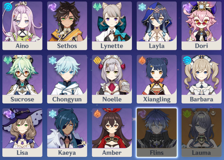 >Current character banner: Flins, Yelan, Aino, Sucrose, Dori