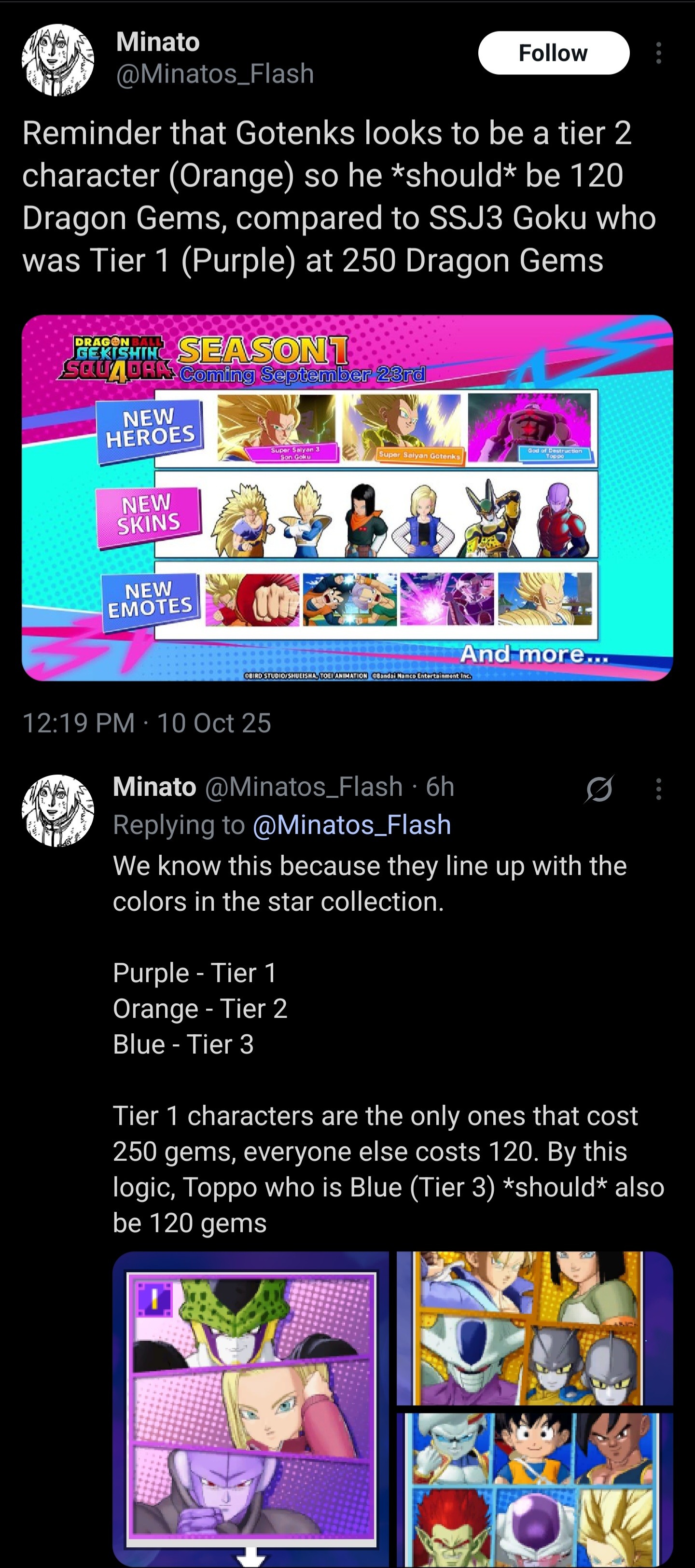 Someone pointed out Gotenks might only cost 120 gems since he's orange tierI would make sense also since they're gonna be free next season to have the first hero released be the most expensive while the next two are much cheaper since less will likely pay for them and instead just wait