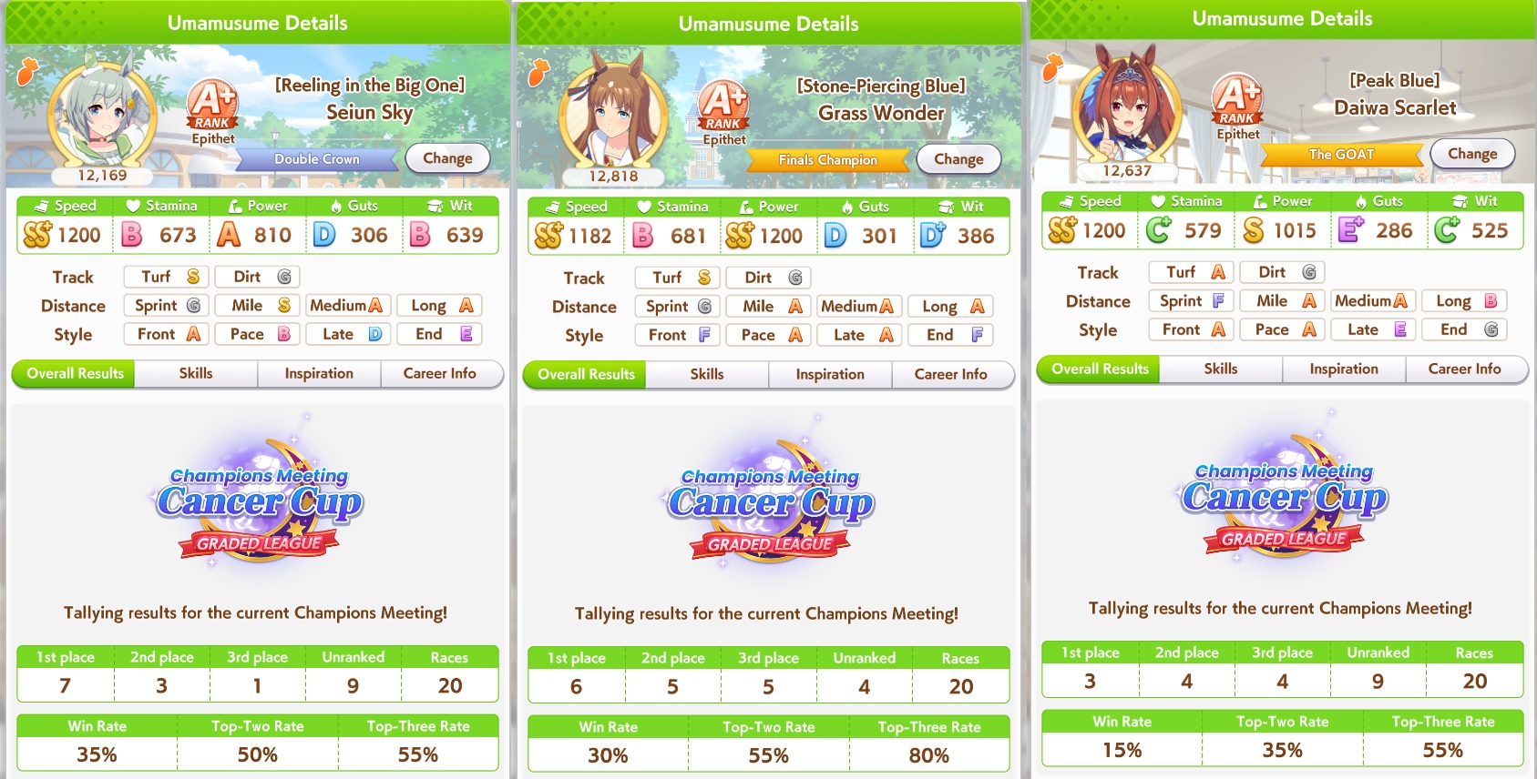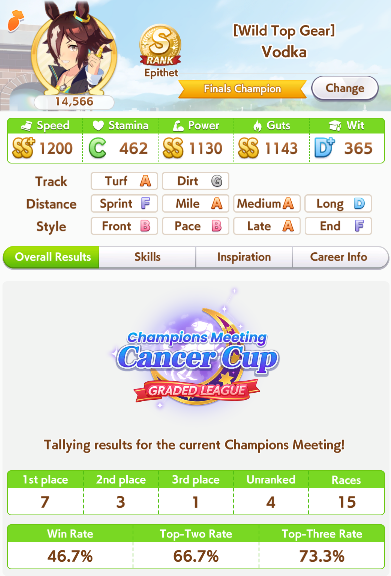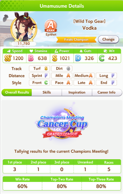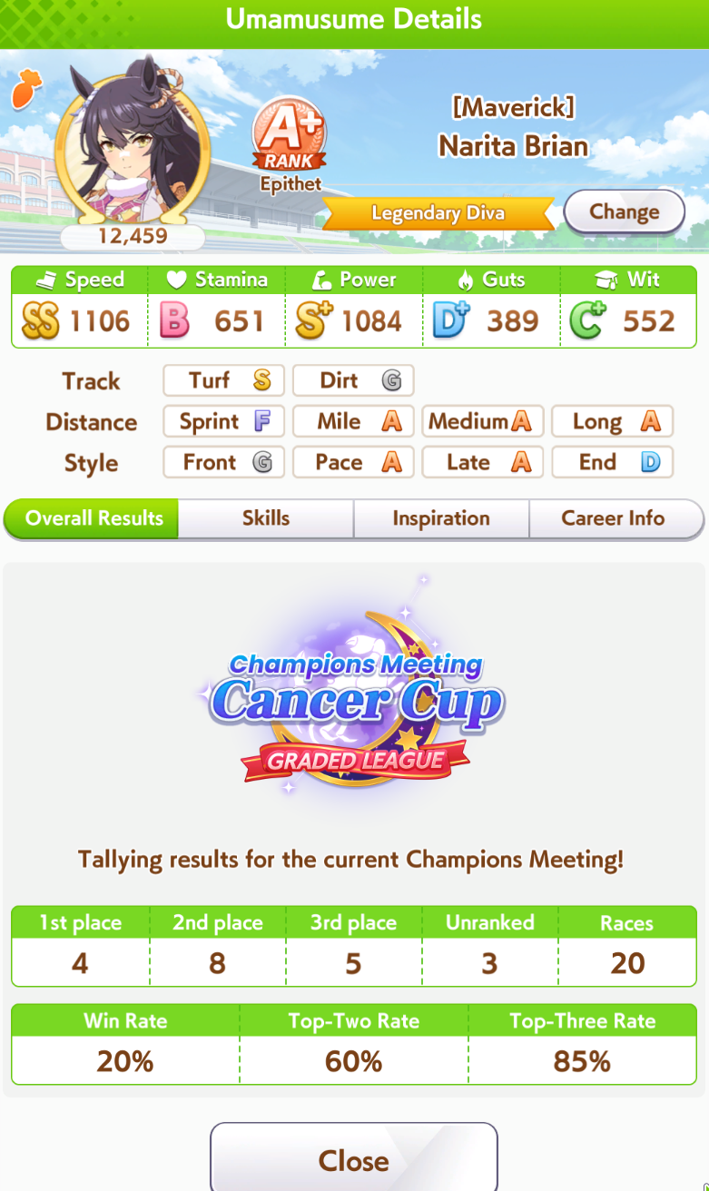 >>542218421I got myself a 2/5, 3/5, 5/5, 4/5 Round 1 which pretty much mirrors my other CM results except that I always hard won my first two rounds and then absolutely beefed the last two. I really like this CM though because I've been seeing so many different Umas instead of ten million Gold Ships. Even though I HAVE faced off against some Gold Ships in my matches already. In fact one Gold Ship almost beat my Smart Falcon that procced A&S and Plancha it was truly a harrowing experience. I feel like CM4 is going to get even scarier as people run Gold Ship AND Summer Maruzensky.