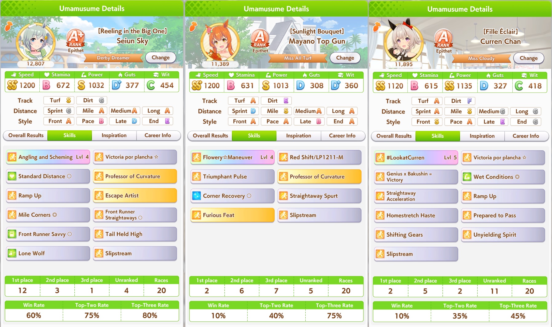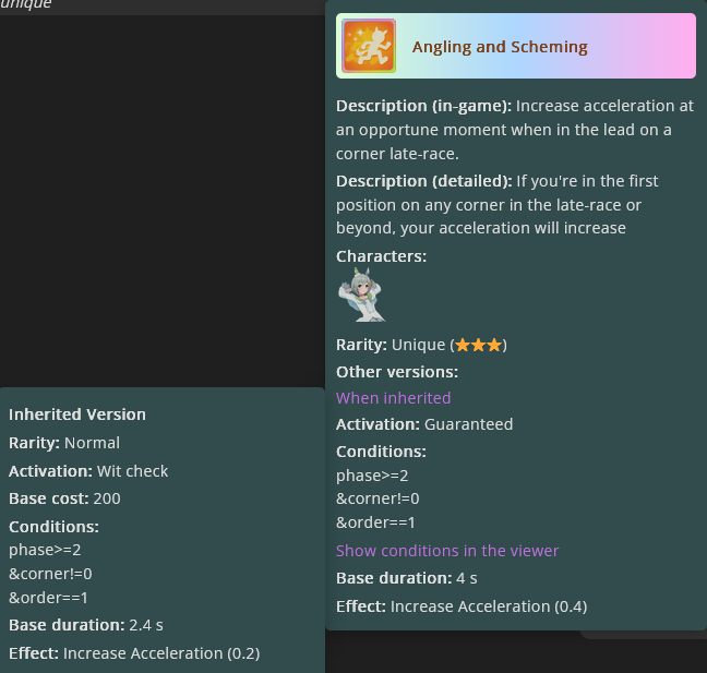 I prefer going up against falcos than seiuns.If a good Seiun activates angling at 1st then you're never catching them. If someone activates the inherited version of Angling then there's a much better chance of catching them with a good pace or a lucky late.