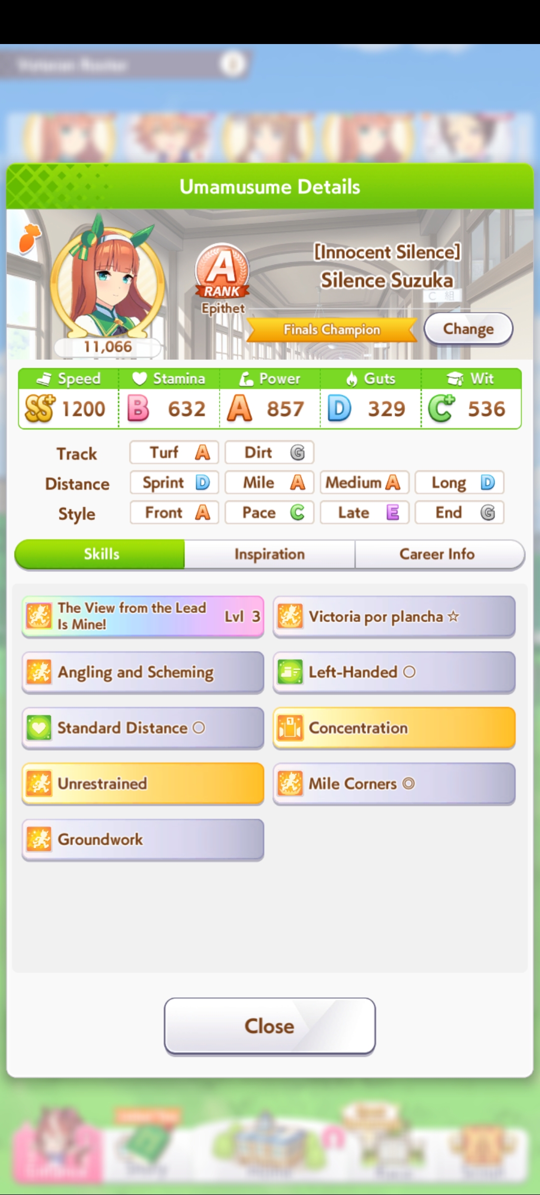NOOOO THIS WAS A GOOD RUN BUT AFTER WINNING TENNO SHO SHE KEPT GETTING MOOD DOWN FAILED TRAININGS AND NIGHT OWL THIS WAS AN EASY 1100SPEED
