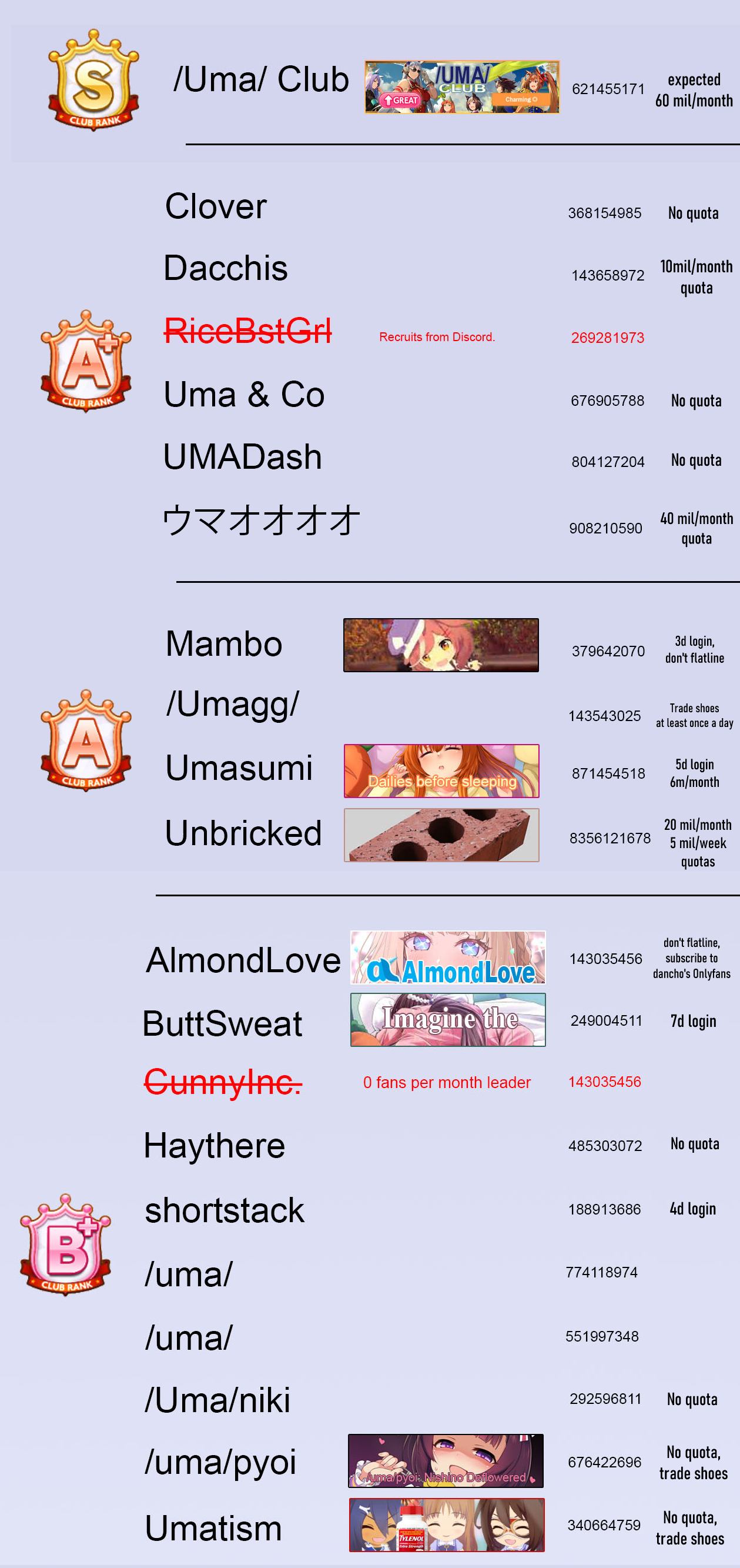 I'm scouting for a club thats>don't got discord (so people actually say things in the chat)>A~A+>20-25m quota (I do 40-50, but I'd like a lower requirement)do we have any like that here? I'm thinking of jumping ship from my current one next month
