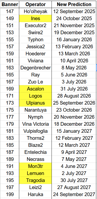 Previous thread: >>542214467>CURRENT, FUTURE GLOBAL/JP/KR CONTENT:[10/10-10/14][Standard]6* Defender Penance, 6* Vanguard Ines (Shop), 5* Caster Corroserum, 5* Supporter Windflit, 5* Medic Paprika (Shop)[9/16-10/14][Ambience Synesthesia]Ines, Stainless; Muelsyse, Mostima, Logos[9/30-10/14]Babel Rerun[9/30-10/14][Like Ending Like Death]6* Specialist Ascalon, 5* Caster Aroma, 5* Defender Bassline, 4* Defender Lutonada[10/14-11/4]The Masses' Travels - 6* Defender Sankta Miksaparato, 1* Vanguard Confess-47[10/14-10/28][Freedom of Preach]6* Specialist Exusiai the Covenant, 6* Sniper Lemuen, 5* Guard Gracebearer[10/14-10/28][Log-In]PhonoR-0 Skin[10/14-11/11][Iteration Provident, EPOQUE, Achievement Stars, Test & BoC]Wiš'adel, Mlynar, Archetto, Mizuki, Fiammetta, Cantabile[10/14-11/11]Reselling a bunch of skins>CURRENT, FUTURE CN CONTENT:[10/9-10/23][Standard]6* Guard Zuo Le, 6* Medic Reed The Flame Shadow (Shop), 5* Specialist Figurino, 5* Specialist Wulfenite, 5* Vanguard Blacknight (Shop)[9/25-10/16]Rebuilding Mandate - Puzzle skin[10/6-10/20][0011]Figurino[10/6-10/20][0011 Re-Edition]Wind Chimes[10/9-10/23]EP16: Abnormal Spectrum - Windscoot skin[10/9-10/23][The Silent Wavelengths]6* Caster Mantra, 5* Defender Vetochki, 5* Guard Wind Chimes, 4* Vanguard Snegurochka[10/9-10/23][Storyboard Breaker]Narantuya, Mitm, Greyy The Lightningbearer, Haze[10/9-10/23][Witch Feast Re-Edition]Degenbrecher, Blaze, Bassline, Popukar; Fiammetta, Dorothy, Quercus, Whisperain>/akg/ website:https://akgcc.github.io>AK EN Database:https://puppiizsunniiz.github.io/AN-EN-Tags/akhrchars.html>More valuable resources:https://rentry.org/akg_resources>/akg/ merch guidehttps://rentry.co/akg_merch