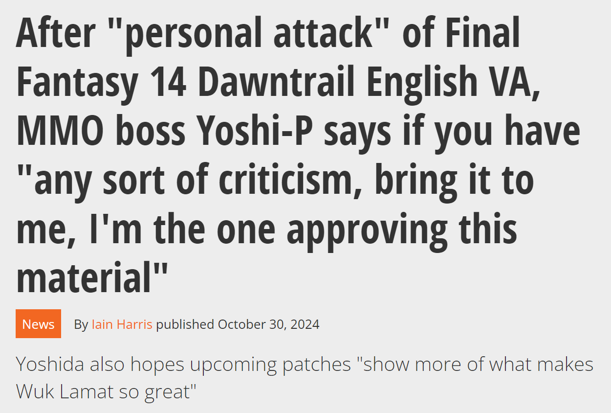 Is XIV good? No, but it's an outlet for balding ex-WoW players, troons and women to ERP with furry characters.Is Dawntrail good? No, but it gives the cult more excuses to give Yoshida their money.Do actual players still love the game? No, but what matters is that you can say that you still like it in order to defend Yoshida's name. Is the new furry MC with the tranny VA good? No, but the cult will say they are good because Yoshida can do no wrong.