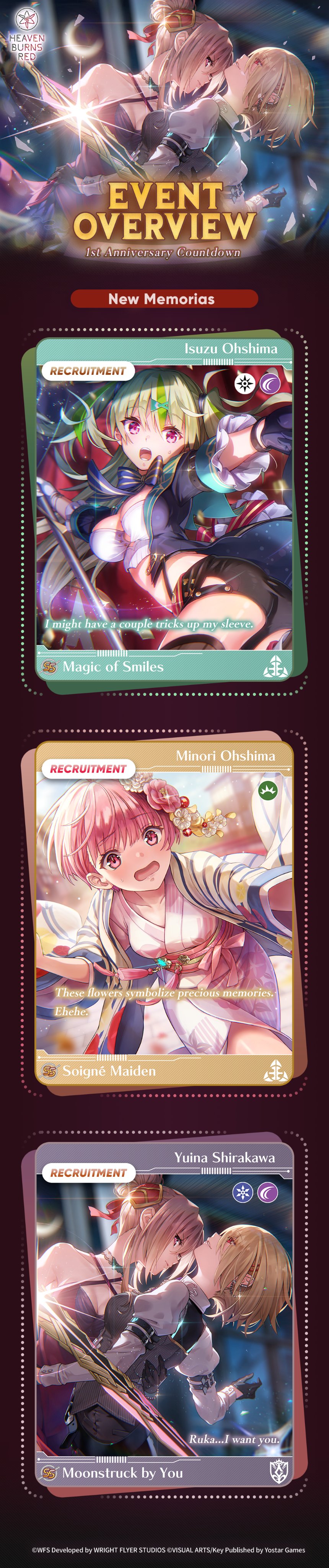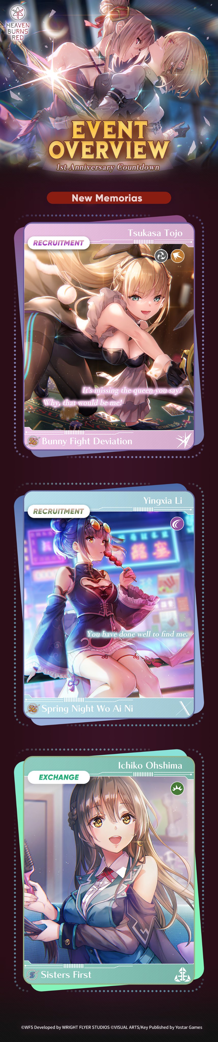 From the twisted mind of Jun Maeda who brought you Angel Beats!, Clannad, AIR, Kanon, Little Busters! and Charlotte.>Is it on PC?Yes, it's on PC and mobile.>Downloadhttps://heavenburnsred.yo-star.com/>Twitterhttps://twitter.com/hbr_official_en/>Current bannersMaki SS2 & Chiroru SS2: https://x.com/hbr_official_en/status/1973055235011805665Aina SS2 & Kanata SS2: https://x.com/hbr_official_en/status/1972692847481487807>Current eventsMain Story Chapter 5 Part 1 - The Workings of the Soul and a Starcrossing Journey: https://www.youtube.com/watch?v=8ncG8Ej6J5YEvent Story - BAD GIRLS' DESTRUCTION: https://www.youtube.com/watch?v=4cR2-mUrEHo>Database/Tier listhttps://en.hbr.quest/https://docs.google.com/spreadsheets/d/e/2PACX-1vRE8-R_xoNaUGGUMa_tHbq4NgUVcO9DzPQ5g9jhPBdOTdTjxsdW5yT3JteKfoS2xxzoyqItREEXSycW/pubhtmlhttps://game8-jp.translate.goog/heavenburnsred/425643?_x_tr_sl=auto&_x_tr_tl=en&_x_tr_hl=en>Game resources (warning, jp spoilers)https://mega.nz/folder/rJ0ARLTK#CHNMWomnFr9kbBa5kb-dxwCaution, newfriends! Do not read the spoilers.tags: yuri, harem, drama, comedy, JRPGPrevious: >>541734307