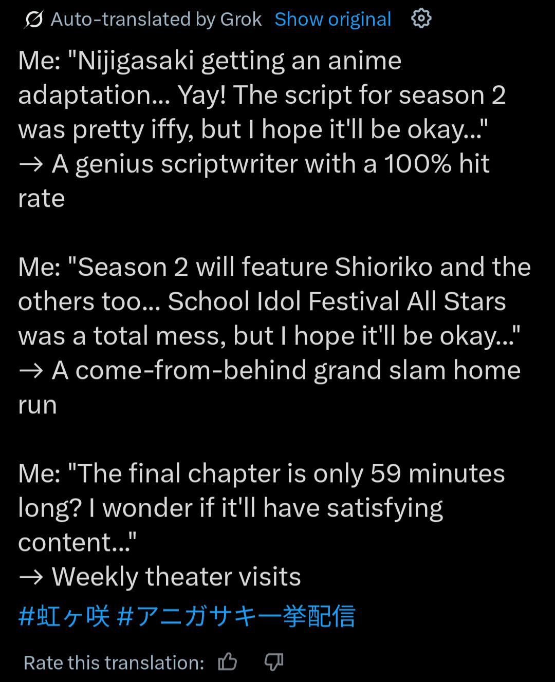 >>542333431>>542336628this except don't watch hasuSNOREra, watch Liella instead, avoid niji at all costs.