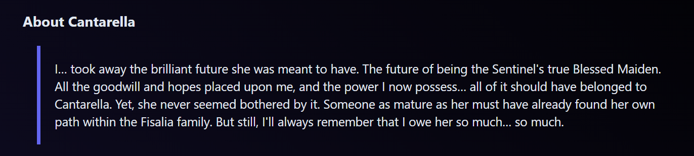 Cartethyia calls you "The one I admire" when you talk to her. She also wants to spar with you, but the game won't let you.