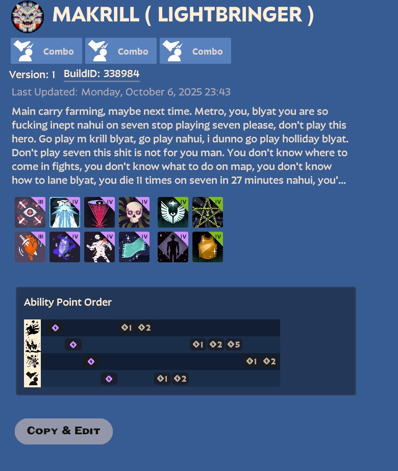 >>542355183the general pattern looks like so:>the lane partner feeds early and/or fucks off to farm every single box in existence, I tell him to come back, he ignores me, our guardian dies>I want to farm our jungle, 3 enemies waltz into me>I want to farm their jungle, 3 enemies waltz into me>I want to help in teamfights, my team scurries off in random directions instead of committing, so 3 enemies waltz into me>Lash/Bebop/Krill>another teamfight begins, I dash and ult when enemies are grouped up, by this point my team scurried off in random directions instead of committing>a random Russian (mostly Haze) on my team doing even worse, exacerbating problemsthere might or might not be exceptions to these