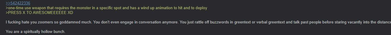>>542478879>I still don't understand how people can hate iceborne but love world.That's just ragebait trolling. No one completely unironically thinks that