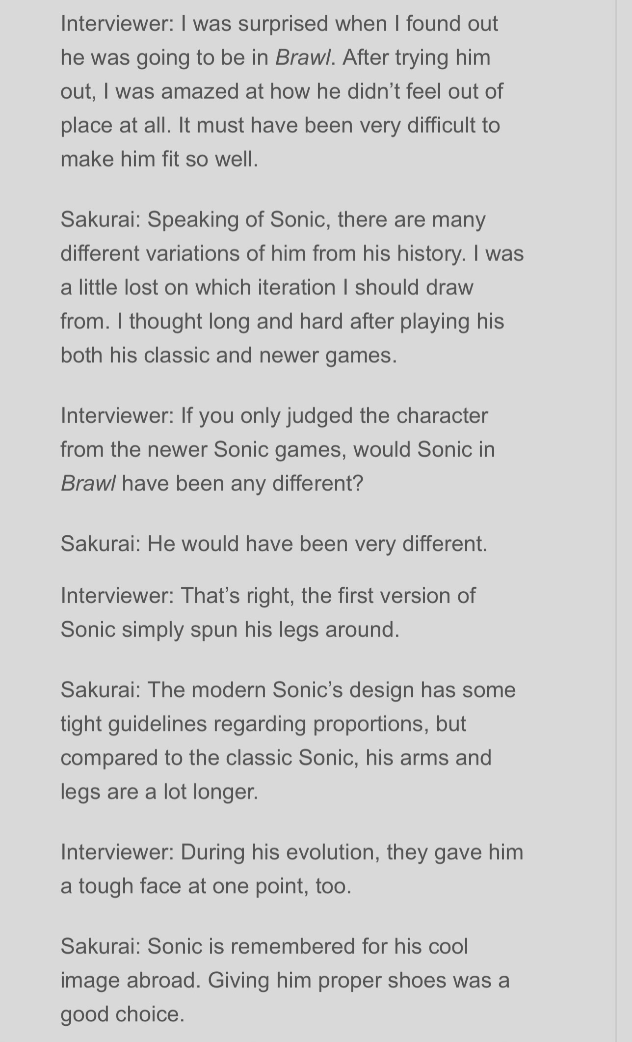 18 years ago Sonic was announced for BrawlPrior he was requested to be in Melee around the time Sega gave up on video game consoles but was too late along with SnakeWhen Brawl came around Sega forgot again to ask early and asked right before the game when gold, Sakurai agreed to delay the game and add Sonic, which led to Toon Link, Wolf, and Jigglypuff being added along side him.When Smash 4 was being worked on Sonic was actually not in the original design docs, it wasn’t until the deal between Sonic Team and Nintendo was agreed upon and Sega sent Sakurai/Sora an early copy of Lost World for references.And with Smash Ultimate Sonic was added simply due to them having to get everyone back.