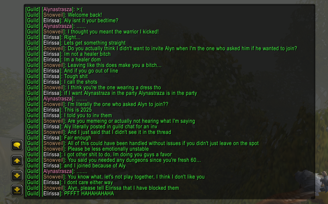 Btw, all I did in the guild chat was talking about the game and only the game here and there, while never insulting anyone from the guildI was typing like 40 times a day, while playing 18 hours a day, that's like 2 times a hour and they were getting so angry about it for some reasonI would talk about the lore of Gilneas, or how healers can't handle stress and this is why they are usually effeminate men, normal game stuffAll jokes aside, I'm not even sure why people got so angry about meMeanwhile, my own guild mate ninja looted from me, 3 people from the guild took his defense for some reason "lol who cares it's just a green item", people would insult me and even ragequit the guild in hope the GM would feel pity for them and kick meAnd in the end... I got kicked for saying the truth...><Evil> has an active officer channel where guildies gossip about people who aren't in it there, and it is hidden by the fact that all roles are just called "Anon", and that the existence of this happening is completely secretiveJust saying this made Aecheur ( Arthur Couton for short ) so angry that he had kick meThen people tried to defend that gkick by saying I was "annoying" and "weird", but then they complain about "normies" all the time??? So being weird is now bad???Really makes you think! Typing all this made me emotional again, I think I'll take a quick 30 minutes break to cry...