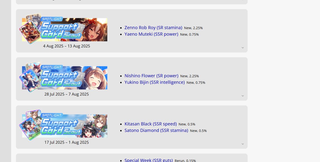 Previous: >>542423552>JP Game NewsCurrent Rate Up: Hishi Akebono (Alt 3*), Marvelous Sunday (Alt 3*), Fuji Kiseki (SSR), Eishin Flash (SSR)10/7 - Legend Race vs NTR and Super Creek (Alt)Early October - Tachyon's Factor ResearchLate October - New training scenarioOctober: CM Sprint - Niigata 1200mNovember: LoH Dirt - Morioka 1600mDecember: CM Mile (No debuffs) - Hanshin 1600m>Global Game NewsCurrent Rate Up: Gold City (3*), Nishino Flower (SSR), Vodka (SSR)10/7 - CANCER CUP - Tokyo 1600m10/14 - Summer Maruzensky (Alt 3*), Summer Special Week (Alt 3*), Sweep Tosho (SSR), Winning Ticket (SSR)10/14 - Summer Story event10/21 - Meisho Doto (3*), Special Week (SSR), Tokai Teio (SSR)10/26 - Half Anniversary Part 110/30 - Eishin Flash (3*), Nice Nature (SSR), Tosen Jordan (SR)10/30 - LEO CUP - Hanshin 2200mTimeline: https://uma.moe/timeline>IP NewsUmamusume Cinderella Gray 2nd cour will air on 10/5Umamusume 6th Live Event Autumn Leg will be held on 10/18-19Guest Starring:Alexandros, Ooishi Masayoshi (Day 1), Kageyama Hironobu (Day 2)https://umamusume.jp/contents/event/tnf6th-autumn/>Thread CirclesJP: ウマオオオオ (20 million/month), PUMA, ウマぴょいのまにまに (No quota)EN: https://rentry.org/globalclubsumaYou must be E3 (20k points) to join a circle. Apply with /uma/ or /vg/ in your profile or post ID in the thread.>All Guides & Resourceshttps://rentry.org/uma26Game databasehttps://gametora.com/umamusume (Click the gear to switch between JP / global server info)A basic guide for newfagshttps://rentry.org/umaglobalFind networks if your region is blocked from the game or clienthttps://www.umavpn.top/93Seiyuu & Concertshttps://rentry.org/umst/uma/ POG (Paper Owners Game)https://rentry.org/umapog