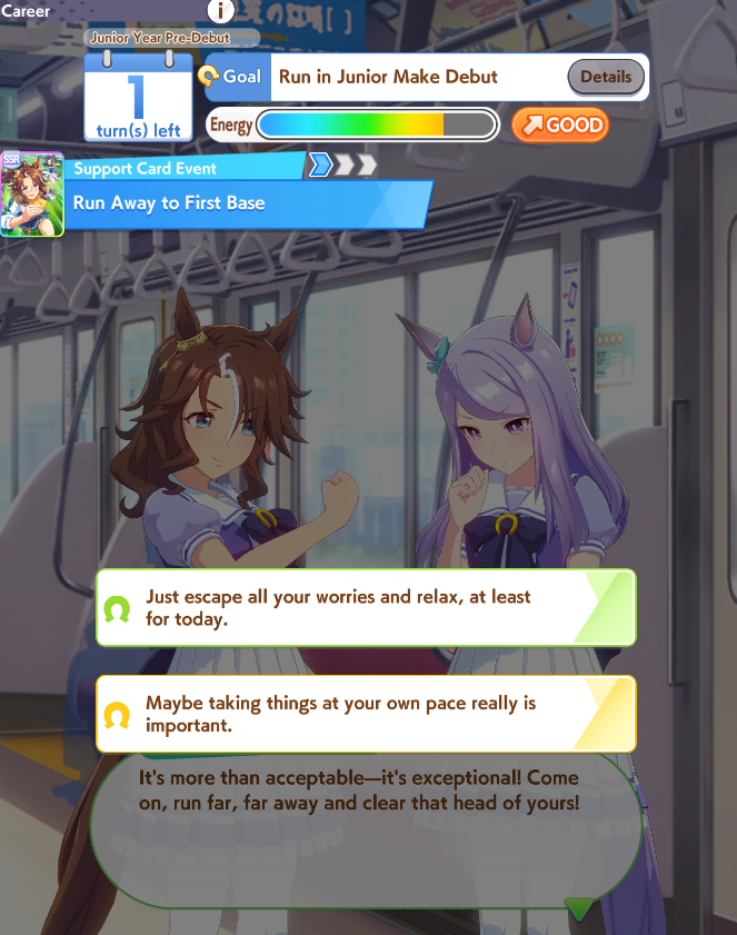 >>542436518Nyes I know that, that's a failed run I just got through after wondering about recoveries and stat lines last thread. Or maybe it was the thread before that I can't remember. Anyway I have to bank on Super Creek being nice to me with her event which I mean...if RNG happens then RNG happens am I right, that's the rule of the game after all!
