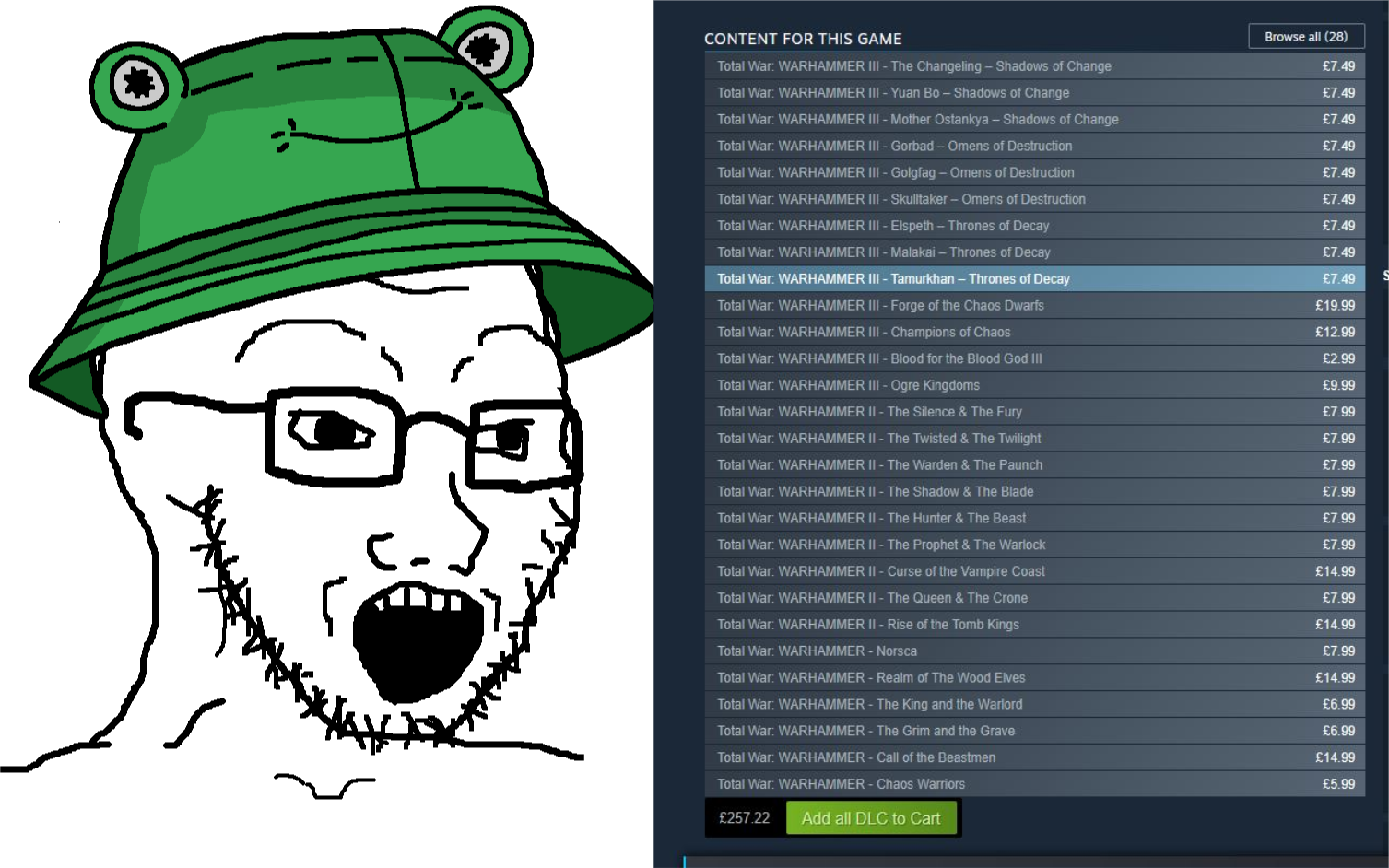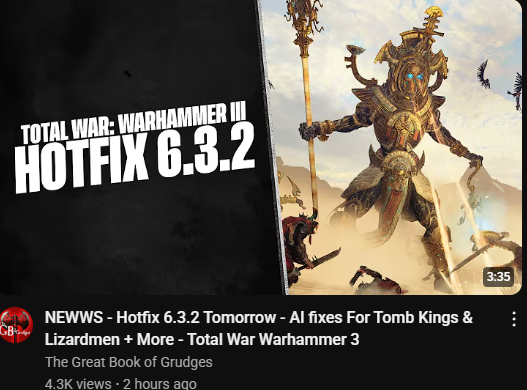 They are right behind you EditionHotfix 6.3.2: https://community.creative-assembly.com/total-war/total-war-warhammer/blogs/79-total-war-warhammer-iii-an-update-on-unit-recruitment-issuesTotal War: WARHAMMER III - Dev Chat 3 - (Aislinn and DLC Changes) https://www.youtube.com/watch?v=wFUm6H-cXko Patch Notes 6.3: https://community.creative-assembly.com/total-war/total-war-warhammer/blogs/78-total-war-warhammer-iii-patch-notes-6-3Patch 6.3 Dev Blog: https://community.creative-assembly.com/total-war/total-war-warhammer/blogs/77Siege Rework: https://community.creative-assembly.com/total-war/total-war-warhammer/blogs/76Tides of Torment delayed: https://community.creative-assembly.com/total-war/total-war-warhammer/blogs/75-total-war-warhammer-iii-tides-of-torment-release-update?page=1Total War 25th anniversary: https://community.creative-assembly.com/total-war/total-war-warhammer/blogs/73-join-us-for-the-total-war-25th-anniversary-celebrations>Stuff1d6chan: https://1d6chan.miraheze.org/wiki/Total_War_Warhammer/TacticsRoll Charts: https://imgur.com/a/81snQma>Total War: Warhammer IIITide of Torment teaser: https://www.youtube.com/watch?v=zQNKhxbQKuM Total War: WARHAMMER III - Dev Chat 1 - DLC talk (Dechala): https://www.youtube.com/watch?v=avVyfLV6YXI Total War: WARHAMMER III - Dev Chat 2 - DLC talk (Sayl): https://www.youtube.com/watch?v=-wN0zM9gp-s >Older TitlesSteam: https://store.steampowered.com/franchise/TotalWar-OfficialPrevious thread: >>542300748