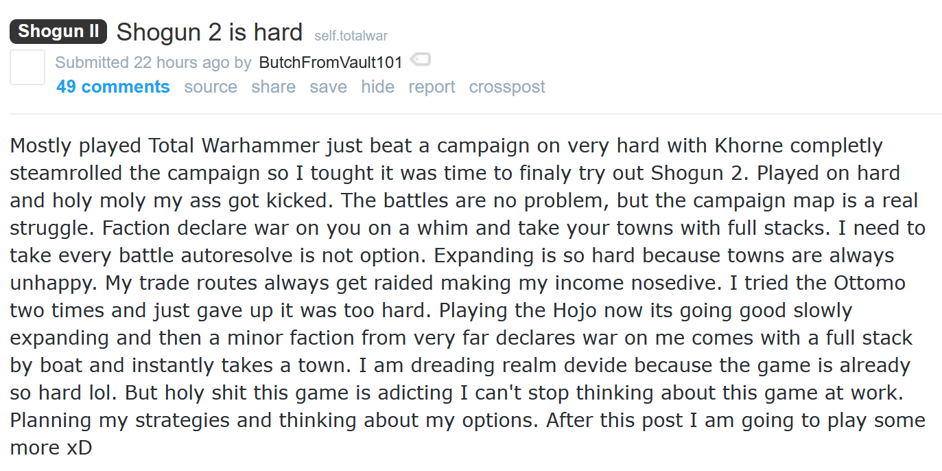 >>5424816053k matches the campaign map in its battle maps just like rome, which is why if you fight near a lake you'll see it in the background. unless you're actually complaining that rome varies props based on if you've built farms and such which is a hearty kek if so. btw i played launch shogun 2 and never had an issue with unplayable maps. apparently no one else did either because rome 2 and attila also have battle maps based off the campaign map