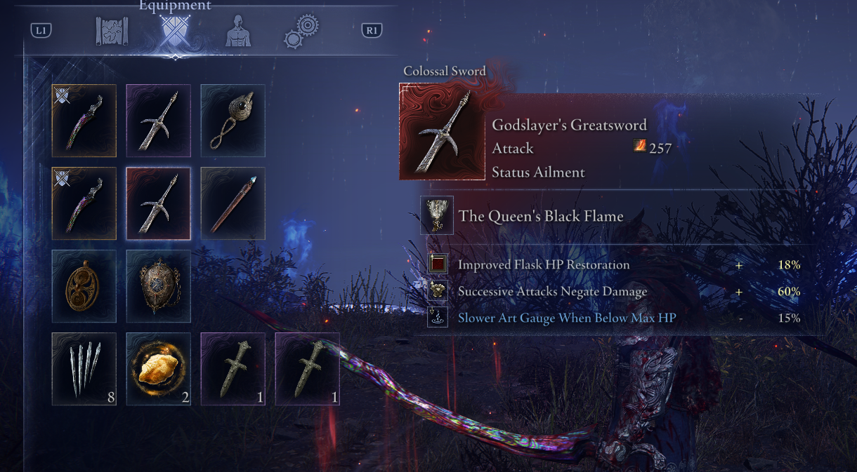 >>542502330on an item it's no big deal, it's not like you want to be running around without your full hp negation up anyway and if you're out of flasks you can just drop iton a relic it's RIP though