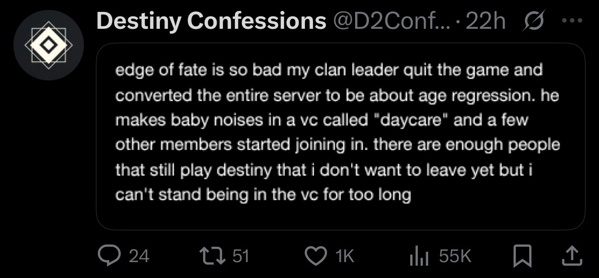 >The next year will be spent walking back all of the Edge of Fate changes with only a Marathon prototype with some Star Wars assets to hold us over until we finally get contentJust execute everyone at Bungie