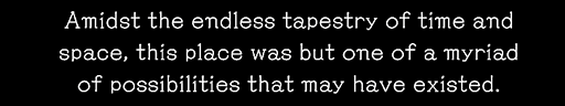 >Amidst the endless tapestry of time and space, this place as but one of a myriad of possibilities that may have existed.