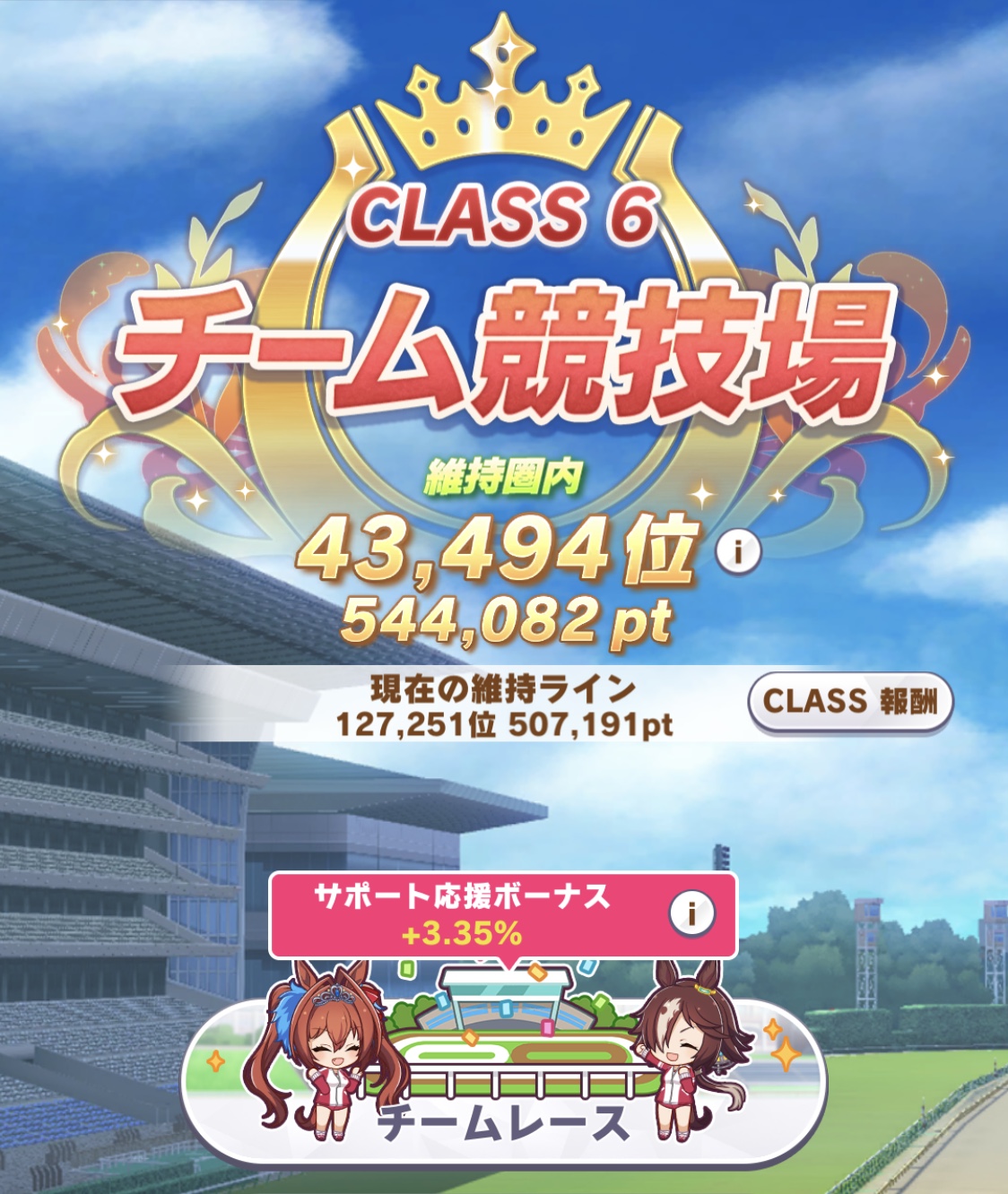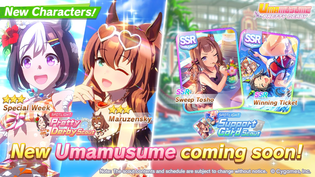 Previous: >>542551242>JP Game NewsCurrent Rate Up: Hishi Akebono (Alt 3*), Marvelous Sunday (Alt 3*), Fuji Kiseki (SSR), Eishin Flash (SSR)10/7 - Legend Race vs NTR and Super Creek (Alt)Early October - Tachyon's Factor ResearchLate October - New training scenarioOctober: CM Sprint - Niigata 1200mNovember: LoH Dirt - Morioka 1600mDecember: CM Mile (No debuffs) - Hanshin 1600m>Global Game NewsCurrent Rate Up: Gold City (3*), Nishino Flower (SSR), Vodka (SSR)10/7 - CANCER CUP - Tokyo 1600m10/14 - Summer Maruzensky (Alt 3*), Summer Special Week (Alt 3*), Sweep Tosho (SSR), Winning Ticket (SSR)10/14 - Summer Story event10/21 - Meisho Doto (3*), Special Week (SSR), Tokai Teio (SSR)10/26 - Half Anniversary Part 110/30 - Eishin Flash (3*), Nice Nature (SSR), Tosen Jordan (SR)10/30 - LEO CUP - Hanshin 2200mTimeline: https://uma.moe/timeline>IP NewsUmamusume Cinderella Gray 2nd cour will air on 10/5Umamusume 6th Live Event Autumn Leg will be held on 10/18-19Guest Starring:Alexandros, Ooishi Masayoshi (Day 1), Kageyama Hironobu (Day 2)https://umamusume.jp/contents/event/tnf6th-autumn/>Thread CirclesJP: ウマオオオオ (20 million/month), PUMA, ウマぴょいのまにまに (No quota)EN: https://rentry.org/globalclubsumaYou must be E3 (20k points) to join a circle. Apply with /uma/ or /vg/ in your profile or post ID in the thread.>All Guides & Resourceshttps://rentry.org/uma26Game databasehttps://gametora.com/umamusume (Click the gear to switch between JP / global server info)A basic guide for newfagshttps://rentry.org/umaglobalFind networks if your region is blocked from the game or clienthttps://www.umavpn.top/93Seiyuu & Concertshttps://rentry.org/umst/uma/ POG (Paper Owners Game)https://rentry.org/umapog