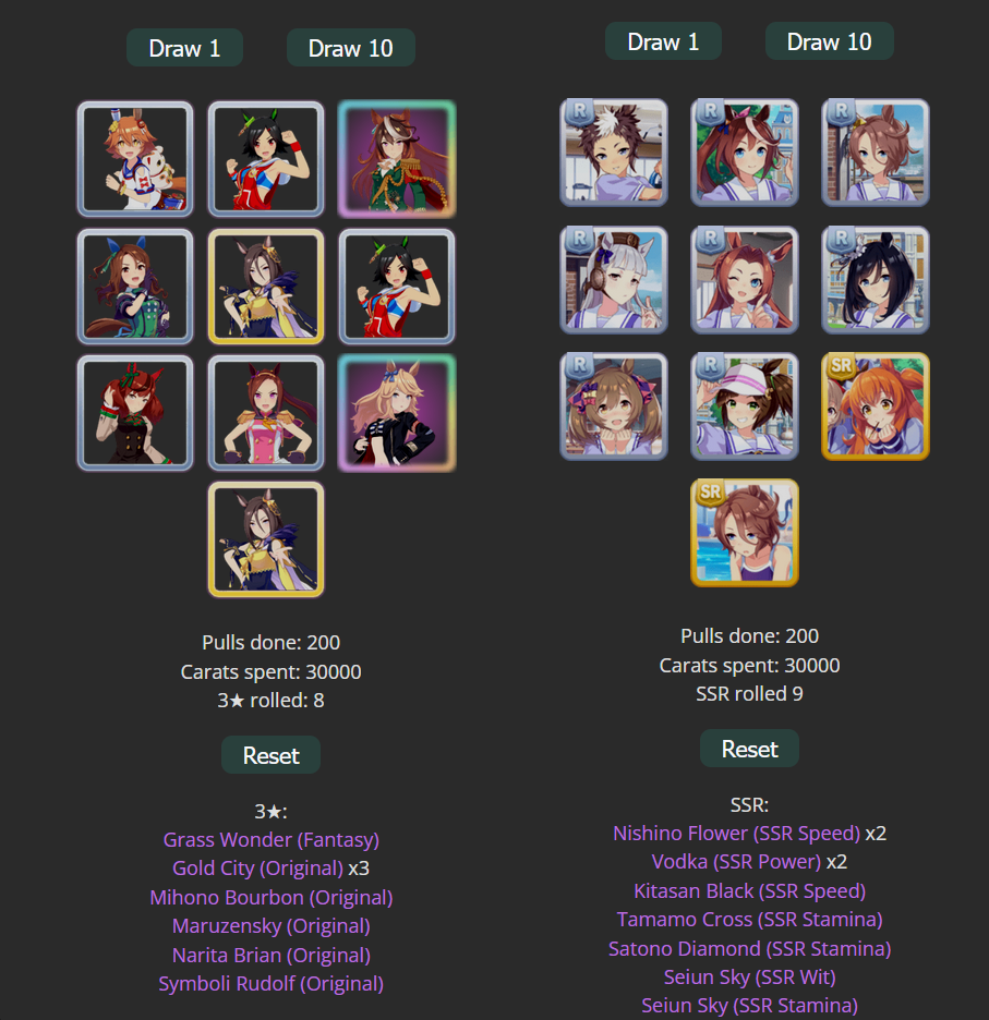 https://gametora.com/umamusume/gacha-simulatorHello hello? My fellow torainas do not forget to purge your horrible luck by using this nifty tool right before you think of rolling. Especially if you're thinking of rolling on Support Banners.