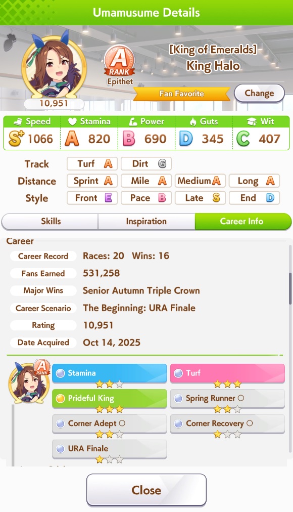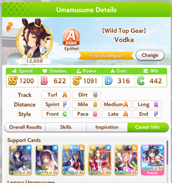 >>542582330That golshi was a rage run because in almost 70 I had never reached max speed. So I just spammed speed trainings, and had DOGSHIT rainbows all senior year. Got speed to lvl 5 by classic November, and RNG was not on my side. Sure it would have been nice to train wit, but I just said screw it and went all in on speed, and then got the best Mile Golshi I'd made. Which isn't very good, I know.