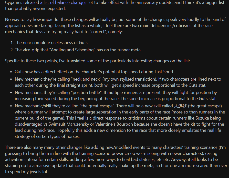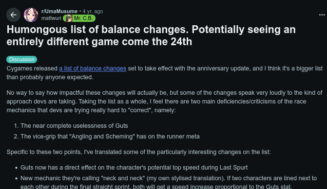 didn't noticed the other thread was on limit already >>542566103>>542565813CM2 was the witlet feast, nearly 98% umas didn't had enough stamina to end the race, I won at least 50 races with all 3 umas winning by a distance from the 4th place. and in CM3 I saw a couple umas that had skills for long and medium races (not the classic tether enjoyer), they were literal carrer failure umas.Umatubers did f2p dirt by telling them Open is not worth it because of nonexistent whales minmaxing and muh group B rewards. because of them Im seal clubbing so hard the rewards are similar to grade group A 1st place