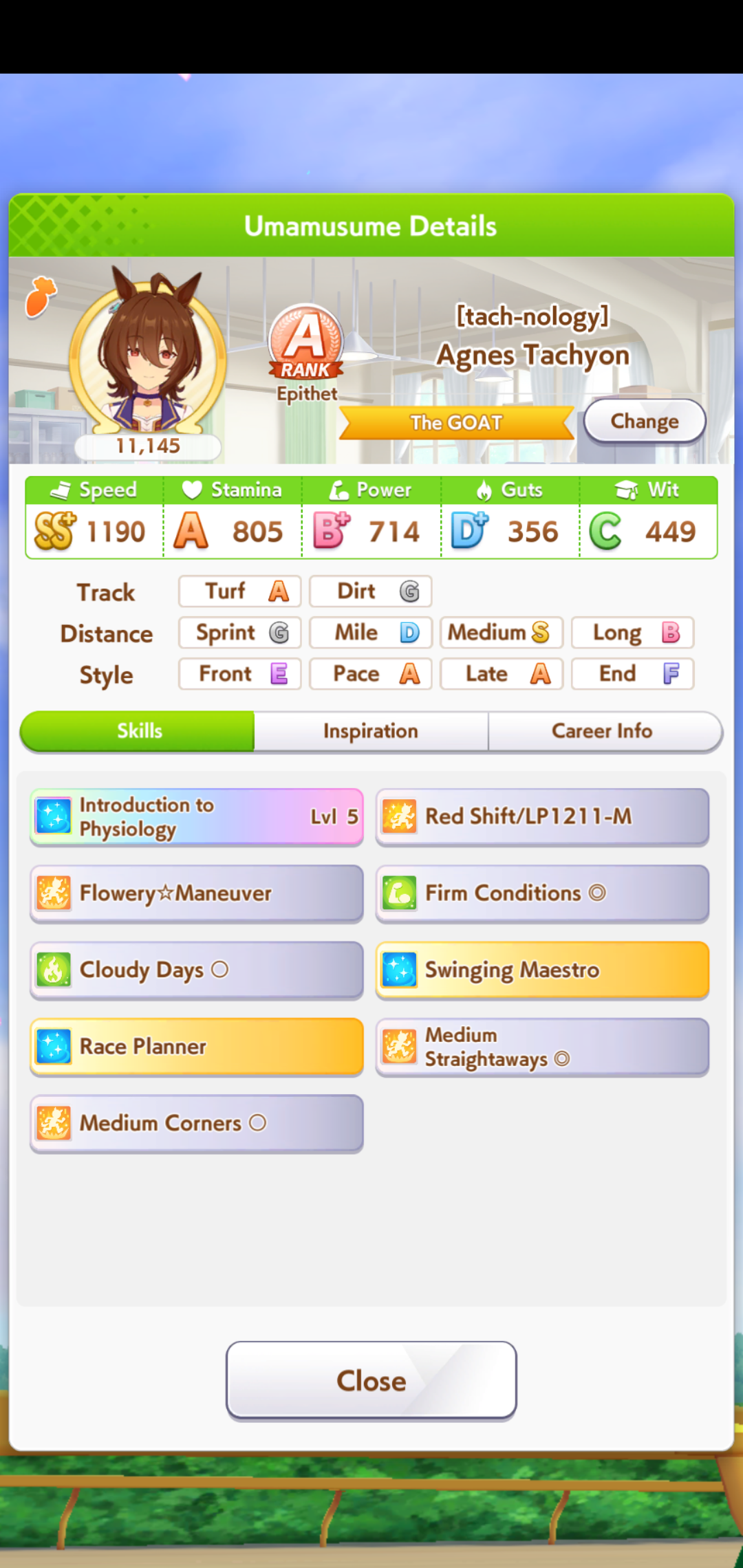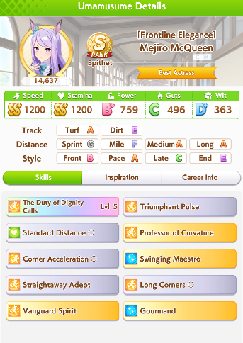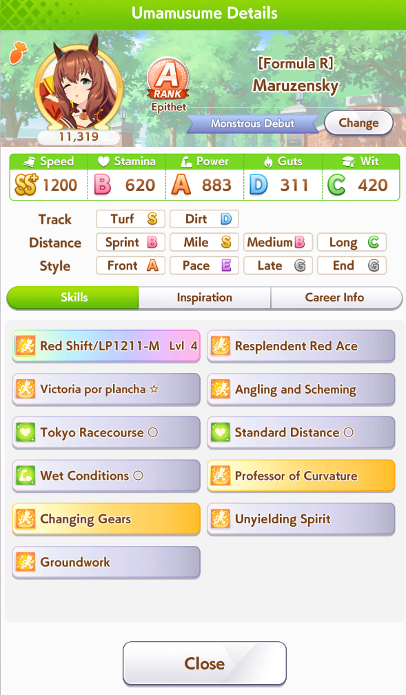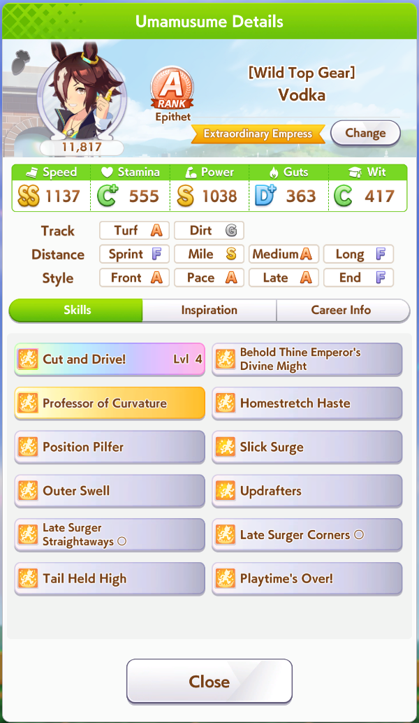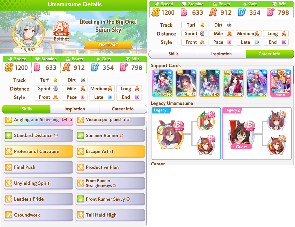 >>542580763You try to get groundwork and first frame accel so you get in the front early race - > You fight for 1st place using pwr/wit/mid speed velocity skills - > You proc accel in the start of last leg and get to your top speed quickly to increase you lead and hope someone really fast doesn't catch up quick enoughCorrect? Then shouldn't Speed stat decide amount of distance you get from accel between you and opponents?