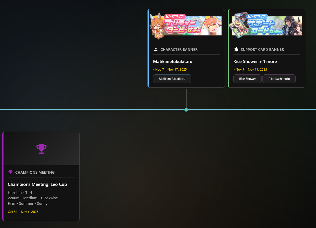 Previous: >>542565984>JP Game NewsCurrent Rate Up: Hishi Akebono (Alt 3*), Marvelous Sunday (Alt 3*), Fuji Kiseki (SSR), Eishin Flash (SSR)10/7 - Legend Race vs NTR and Super Creek (Alt)Early October - Tachyon's Factor ResearchLate October - New training scenarioOctober: CM Sprint - Niigata 1200mNovember: LoH Dirt - Morioka 1600mDecember: CM Mile (No debuffs) - Hanshin 1600m>Global Game NewsCurrent Rate Up: Gold City (3*), Nishino Flower (SSR), Vodka (SSR)10/7 - CANCER CUP - Tokyo 1600m10/14 - Summer Maruzensky (Alt 3*), Summer Special Week (Alt 3*), Sweep Tosho (SSR), Winning Ticket (SSR)10/14 - Summer Story event10/21 - Meisho Doto (3*), Special Week (SSR), Tokai Teio (SSR)10/26 - Half Anniversary Part 110/30 - Eishin Flash (3*), Nice Nature (SSR), Tosen Jordan (SR)10/30 - LEO CUP - Hanshin 2200mTimeline: https://uma.moe/timeline>IP NewsUmamusume Cinderella Gray 2nd cour will air on 10/5Umamusume 6th Live Event Autumn Leg will be held on 10/18-19Guest Starring:Alexandros, Ooishi Masayoshi (Day 1), Kageyama Hironobu (Day 2)https://umamusume.jp/contents/event/tnf6th-autumn/>Thread CirclesJP: ウマオオオオ (20 million/month), PUMA, ウマぴょいのまにまに (No quota)EN: https://rentry.org/globalclubsumaYou must be E3 (20k points) to join a circle. Apply with /uma/ or /vg/ in your profile or post ID in the thread.>All Guides & Resourceshttps://rentry.org/uma26Game databasehttps://gametora.com/umamusume (Click the gear to switch between JP / global server info)A basic guide for newfagshttps://rentry.org/umaglobalFind networks if your region is blocked from the game or clienthttps://www.umavpn.top/93Seiyuu & Concertshttps://rentry.org/umst/uma/ POG (Paper Owners Game)https://rentry.org/umapog