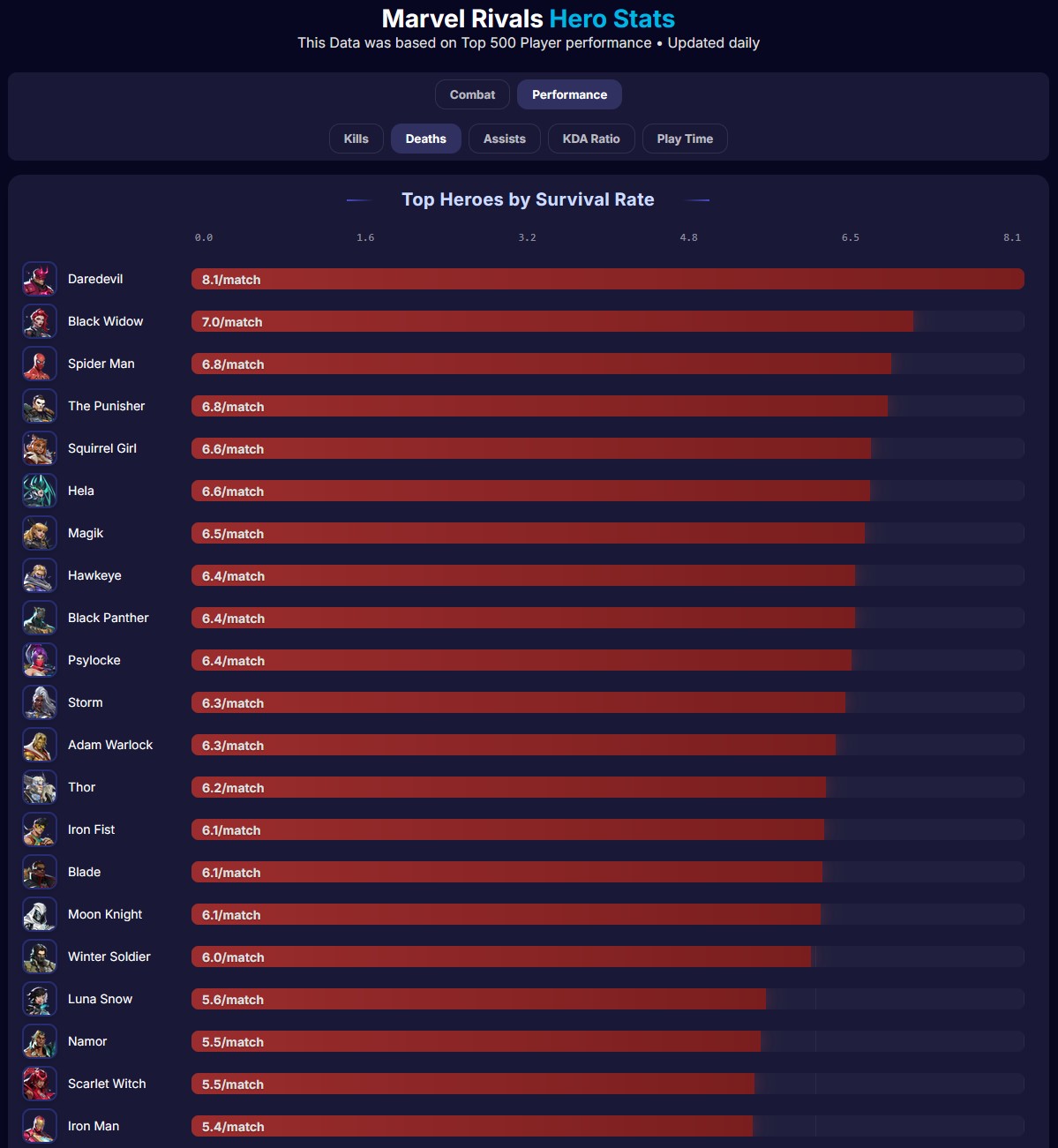 >daredevil is topping the death chartslol, you can really tell it's a bunch of players that has never played a diver before>>542602709You just average number of deaths based on match length. There are no stats for that specifically.