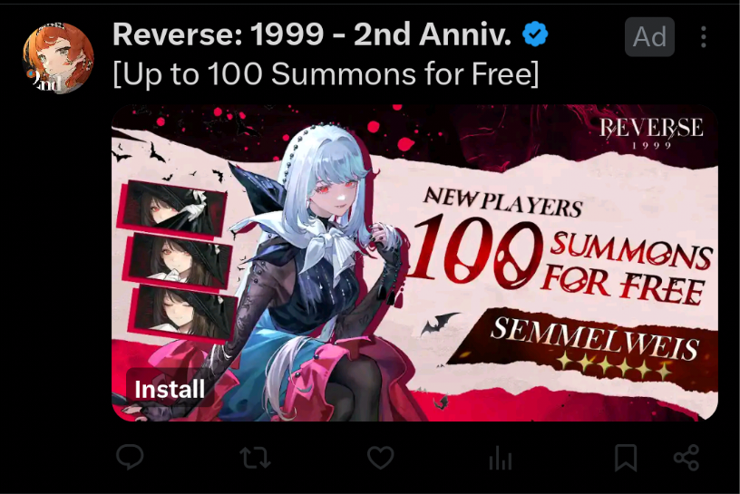 Previous Era: >>542471641>General InfoReverse: 1999 is a turn-based gacha RPG with gameplay revolving around the use of spell cards. The game focuses on storytelling, with a rich main story mode and frequent side-story events. The game is fully voiced in 4 languages, with English as the primary one. There are no PvP elements, you can play at your own pace.Daily reset is at 5AM UTC-5GL 2.8 - http://youtu.be/0fZnlljoor4 | http://youtu.be/GJP4E2RLdPkCN 3.0 - http://youtu.be/20YLmzTQUSkCN 3.1 - http://youtu.be/GjFAnAjGB0M09/19 - 10/27 | PARADISE REGAINED>Current Content09/19 - 10/27 | Against the Flood09/19 - 10/30 | Pre-Storm Protocol (Ulrich Mode)09/19 - 10/30 | In Her Own Reflection (Nautika's Story)09/25 - 10/30 | A Pirate's Guide to Lab Disasters09/25 - 10/30 | Critter Crash10/01 - 10/15 | A Long Way from Home10/09 - 10/30 | A Moment on the White Expanse (Moldir's Story)10/09 - 10/30 | When the Alarm Sounds10/13 - 10/23 | Double Analysis10/13 - 10/23 | Projecting Desargues>Upcoming Content10/23 - 10/30 | A Letter from No Man's Land (3.0 Tease)>Current Banners09/19 - 10/30 | ⧖ | Nautika (Spirit DPS) | http://youtu.be/UwBoJQ-g8GI09/19 - 10/30 | ◈ | Euphoria Rate-up 1x100%: Ezra, Jessica, Melania, M.Pocket, Regulus, Semmelweis10/01 - 10/15 | ◷ | Lucy (Intellect DPS)10/07 - 10/21 | ⟳ | Lopera (Beast Support)10/09 - 10/30 | ※ | Moldir (Beast DPS) | http://youtu.be/vKWhDpY59rg>Upcoming Banners10/21 - 11/04 | ⟳ | J (Beast DPS)10/30 - 10/?? | ※ | Sentinel (Mineral DPS) | http://youtu.be/MvpUd5IOrvc>[ Download ] http://re1999.bluepoch.com | http://store.steampowered.com/app/3092660>[ Resources ] Builds, Farming, Links, Lore, etc | http://rentry.org/1999-resources>[ Merchandise ] http://reverse1999.store>Codes1999GIFT, 5YRBRF9, GachaGaming1999, EndsOfTheEarth, UnforgettableNight, GazingIntoAbyss, UnbreakableAxe, TheMotherSpirit, 1999Happy2ndAnniv, NoWayBack