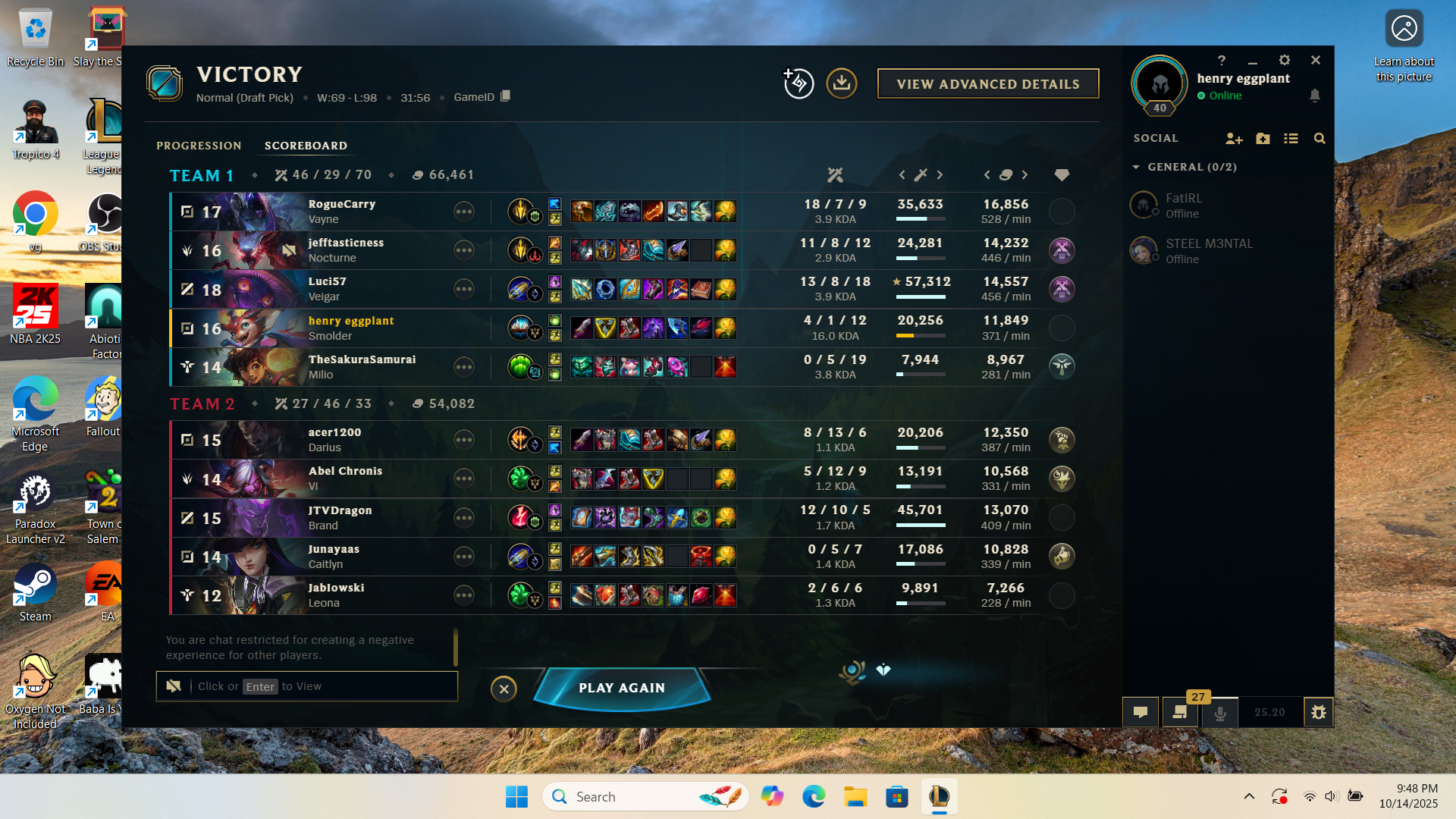 I decided to skim over the T1 vs IG games to see if I could guess the picks even before seeing the games, amazing, I got them right 4 out of times.4 out of 4 times I knew Ambessa, K'Sante, sION and Rumble would be picked on toplane. I knew Vi, Xin Zhao, Jarvan and Noc, Wukong would also picked.Orianna, Akali, Hwei too...What a dogshit garbage game, there's no point in watching League anymore. Imagine still playing League.Imagine STILL playing League. Lmfao.And to think that there was a time where stuff like AP Kog'Maw or Fiddlesticks support was meta, or Vayne ADC too...Can you IMAGINE? People used to be hyped because Fizz and Lee Sin were very meta back then. So much changed... There was even a time Riven midlane was meta.